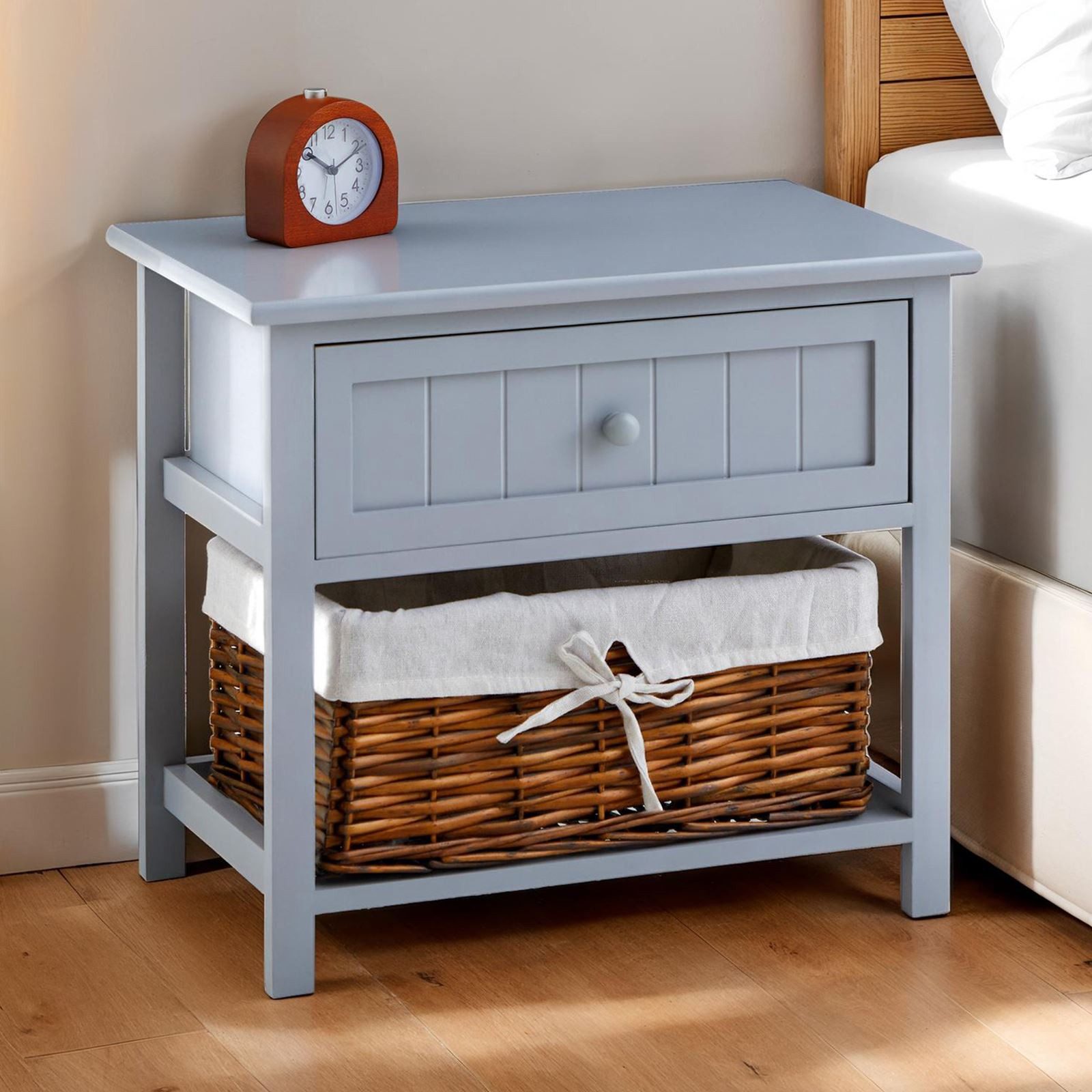Der Akure Beistelltisch im modernen Landhausstil bietet eine kompakte Lösung für Ihr Schlafzimmer. Gefertigt aus massivem Kiefernholz, fügt er sich harmonisch in jede Umgebung ein. Der Weidenkorb mit Stoffeinsatz und die zusätzliche Schublade bieten reichlich Stauraum für Ihre Gegenstände. Ideal für den Einsatz neben Boxspringbetten oder als kleiner Nachtschrank, ist dieser Tisch ein stilvolles und funktionales Möbelstück.