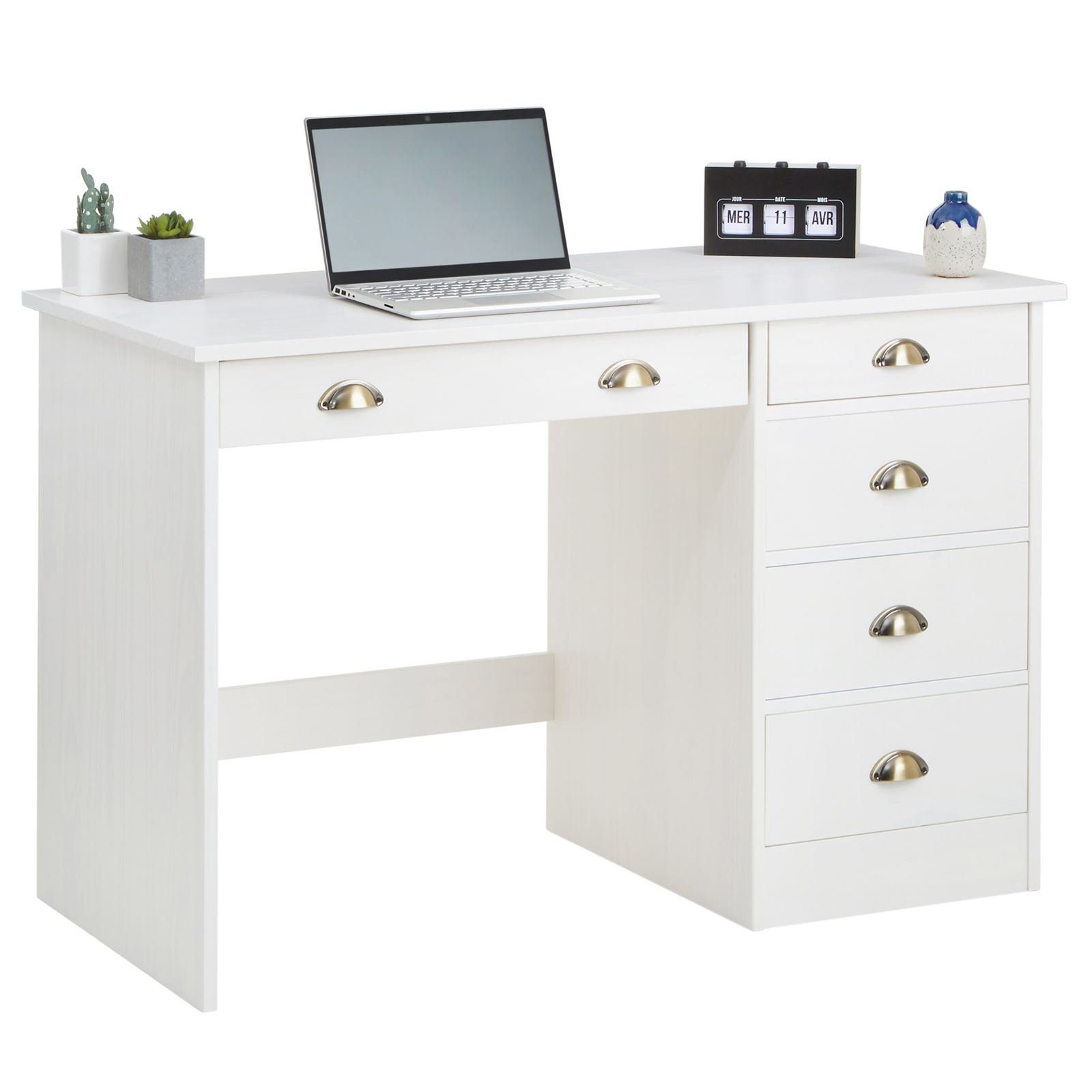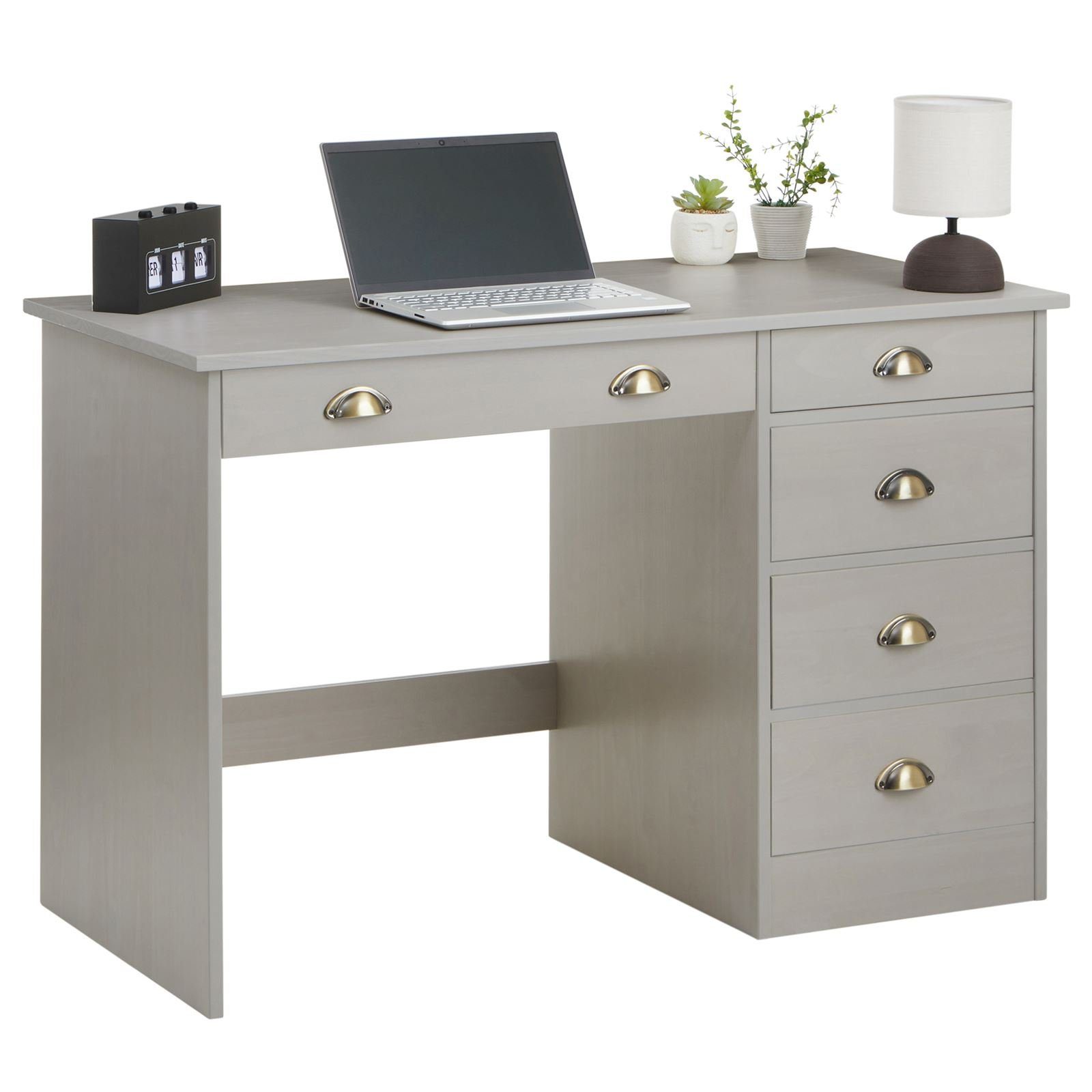 Der Schreibtisch LANA aus massivem Kiefernholz überzeugt mit zeitlosem Landhausstil und praktischer Ausstattung. Fünf Schubladen bieten viel Stauraum für Bücher, Unterlagen oder Schreibmaterial. Eine zusätzliche Schublade unter der Tischplatte ermöglicht das Verstauen von Tastatur und Maus. Die sichtbare Holzmaserung und Muschelgriffe unterstreichen das natürliche Design. Stabilität erhält der Tisch durch eine Querstrebe. Lackiert mit schadstoffarmen, lösemittelfreien Lacken.