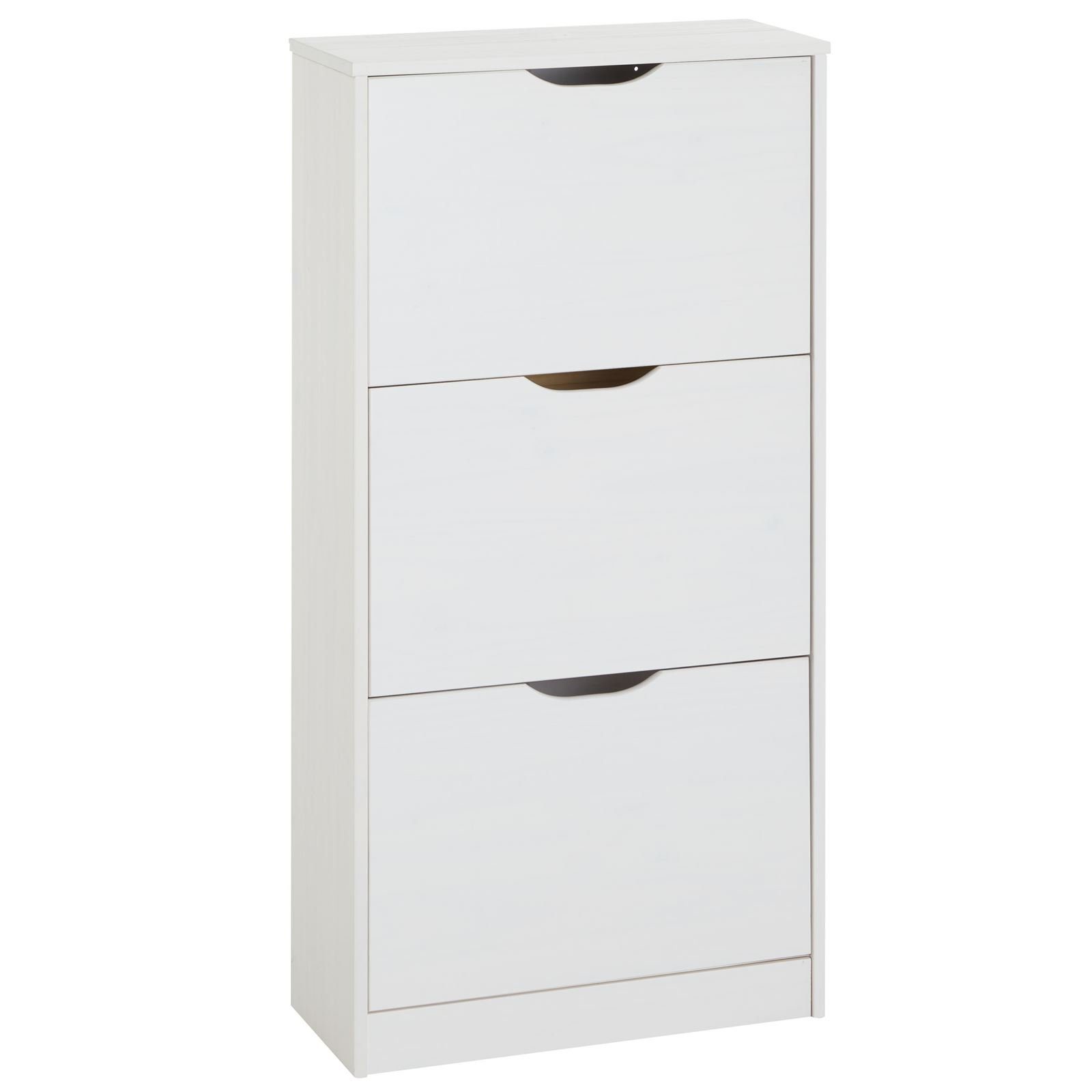 ist aus massivem Kiefernholz gefertigt und weiß lackiert. Die Maserung des Holzes bleibt sichtbar und spiegelt den typischen Landhauscharakter wieder. In den 3 Kippfächern ist ausreichend Platz für bis zu 18 Paar Schuhe gegeben.