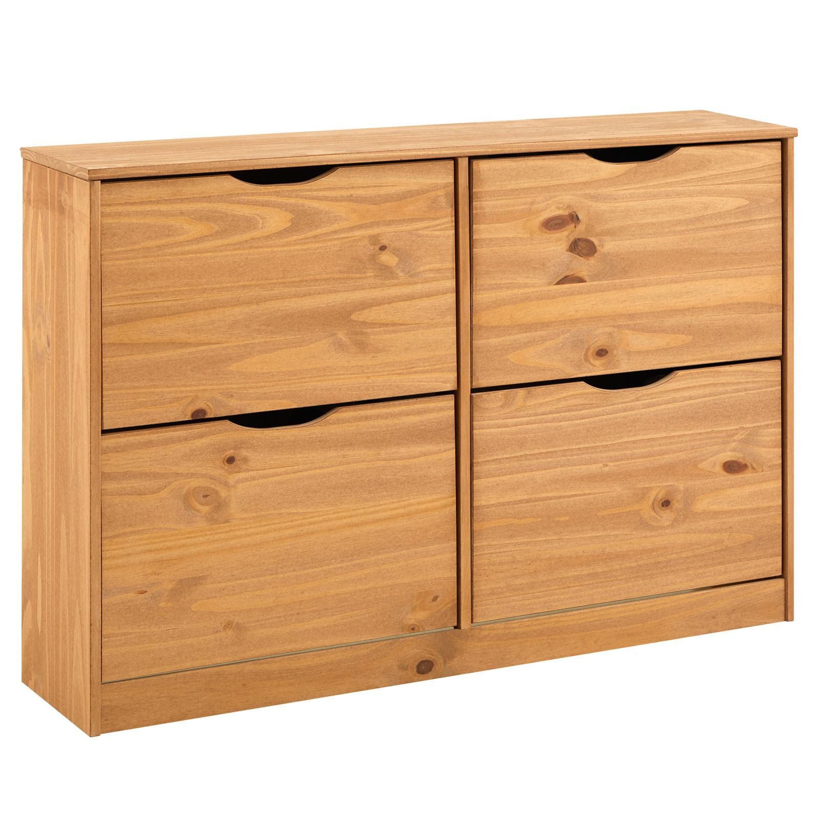 ist aus massivem Kiefernholz gefertigt und honigfarben lackiert. Die Maserung des Holzes bleibt sichtbar und spiegelt den typischen Landhauscharakter wieder. In den 4 Kippfächern ist ausreichend Platz für bis zu 24 Paar Schuhe gegeben.