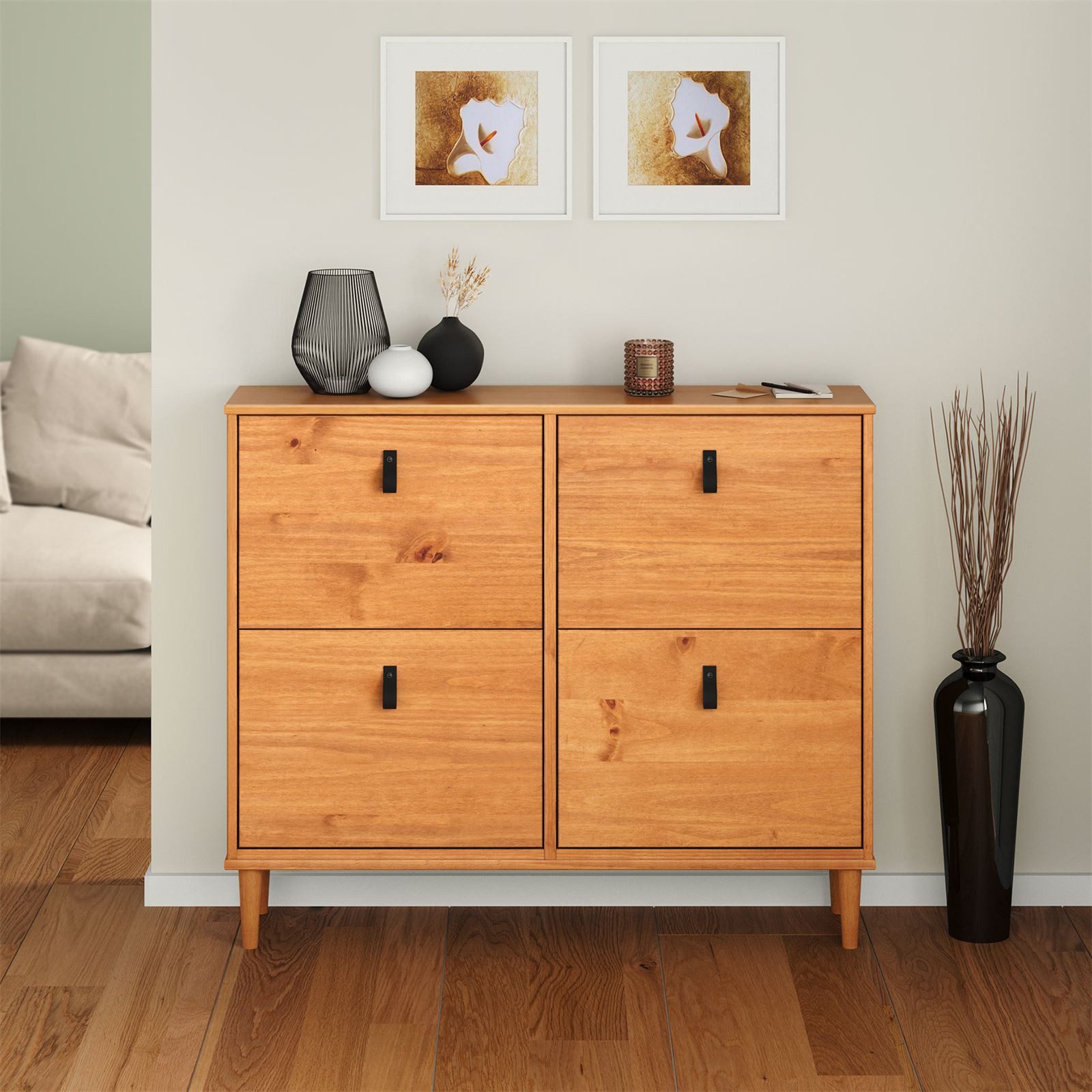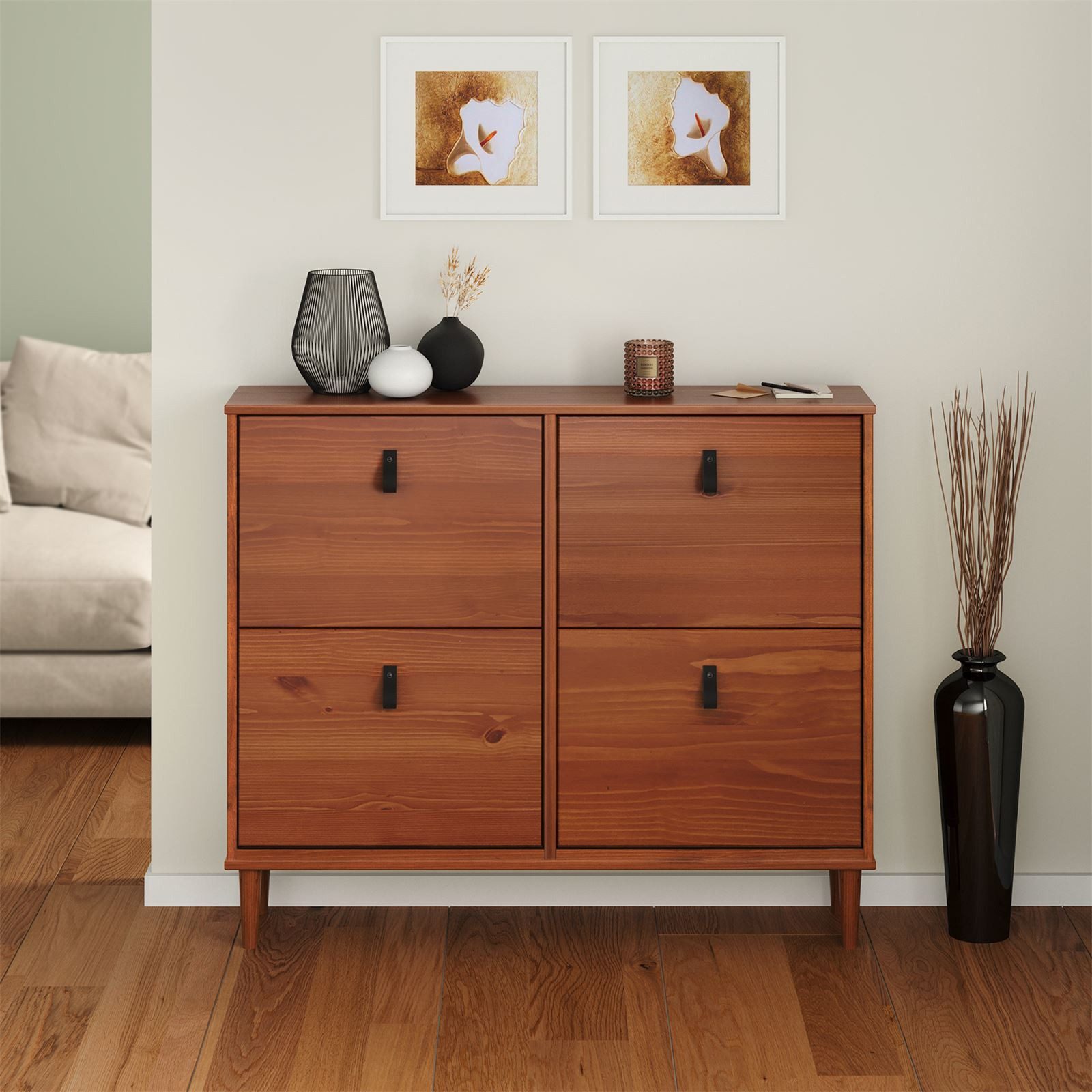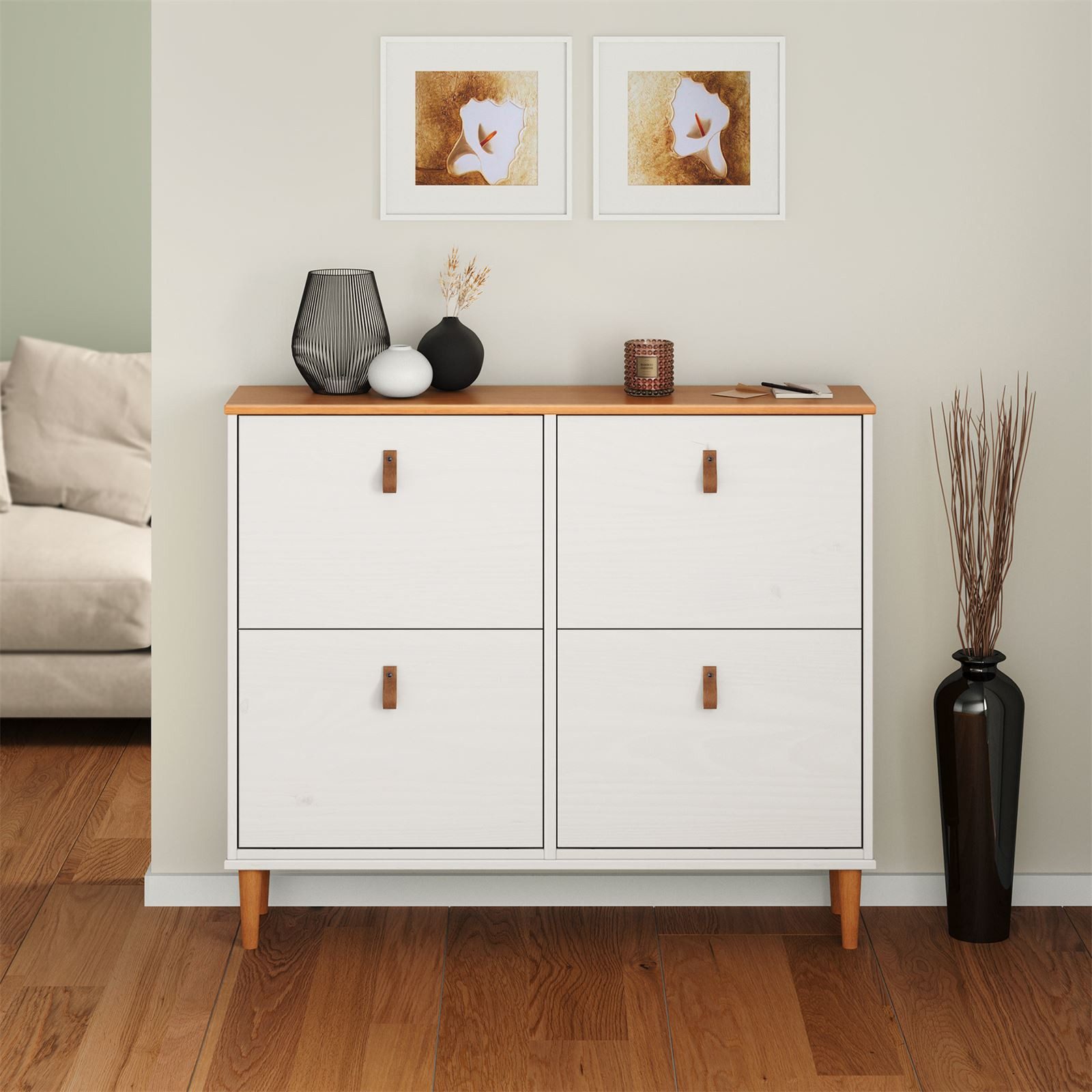 Der schmale Schuhschrank MIKKA vereint Funktionalität mit modernem Design in einer kastanienfarbenen Lackierung, während die schwarzen Ledergriffe einen eleganten Akzent setzen. Ausgestattet mit vier praktischen Klappen bietet dieser Schuhorganizer platzsparenden Stauraum für bis zu 24 Paar Schuhe bis Размер 43. Materialbeschreibung: