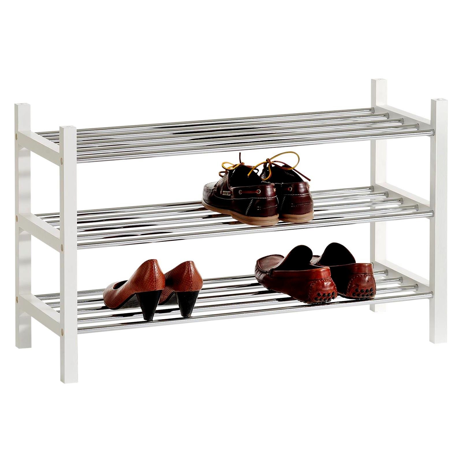 ist ein platzsparendes Schuhregal für Diele oder Flur. Bis zu 12 Paar Schuhe finden hier ihren Platz und für eine größere Schuhsammlung können mehrere dieser Regale übereinander gestapelt und zu einem großem Schuhregal kombiniert werden. Edel verchromte Metallrohre in Kombination mit lackiertem Kiefermassivholz verleihen der Schuhablage einen Design-Look und eine hohe Stabilität.