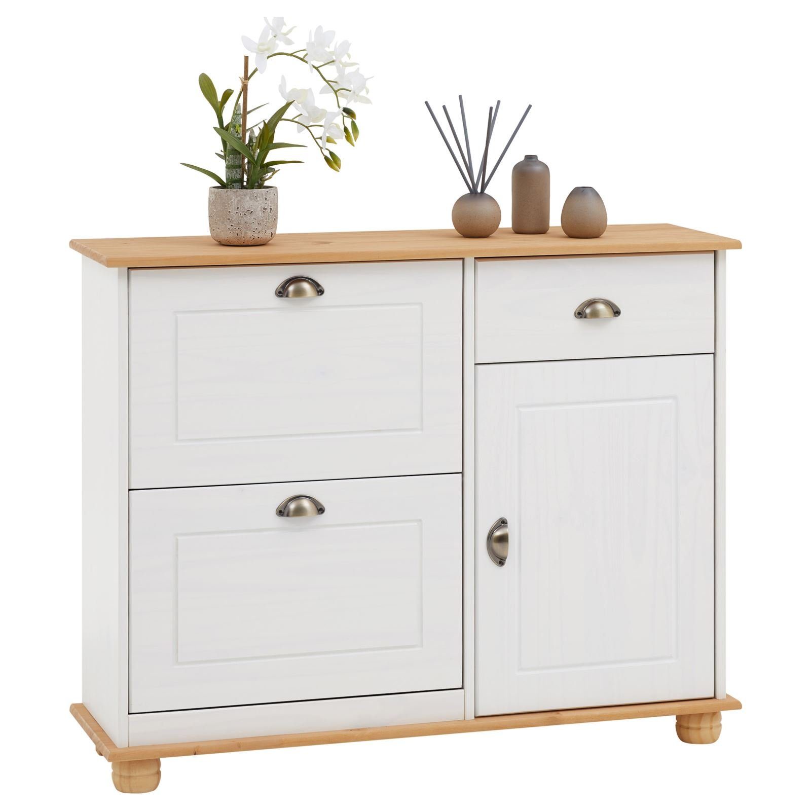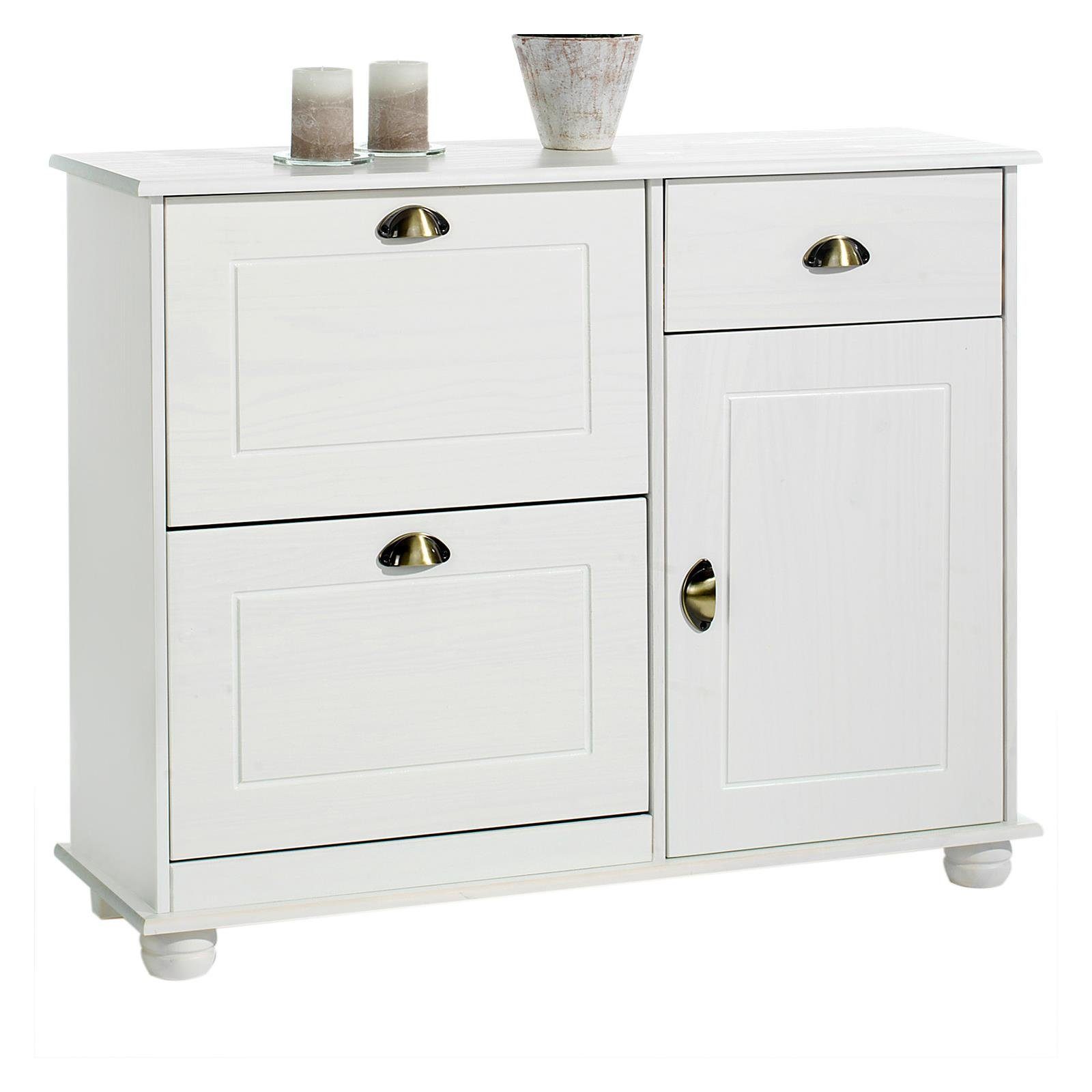 bietet in seinen 2 Klappen ausreichend Platz für ca. 12 Paar Schuhe. Das Schrankfach und die Schublade verfügen über ausreichend Stauraum für Mützen, Handschuhe oder andere Accessoires. Das massive Kiefernholz macht den Dielenschrank zu einem zeitlosen Möbelstück und strahlt eine angenehme Wärme aus.