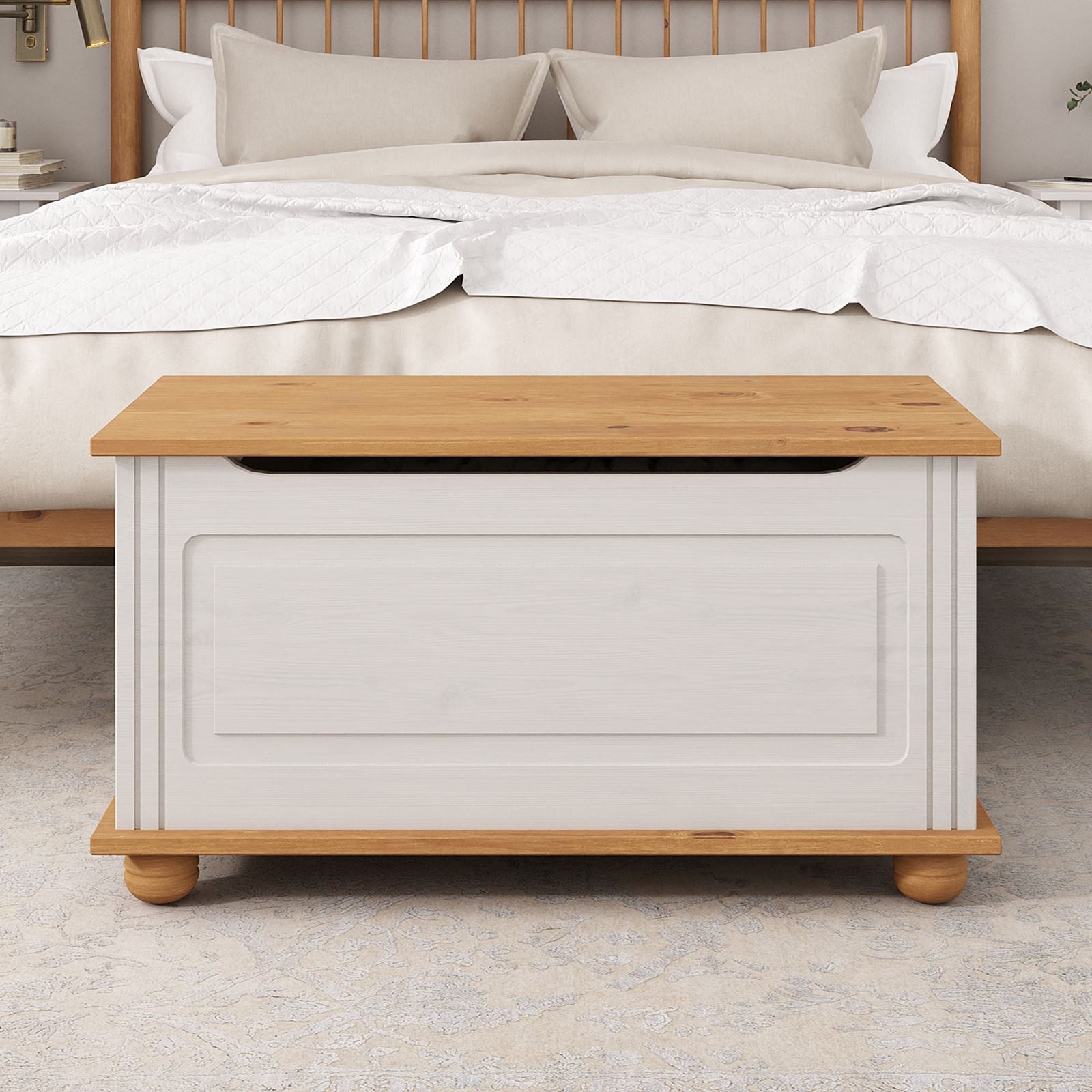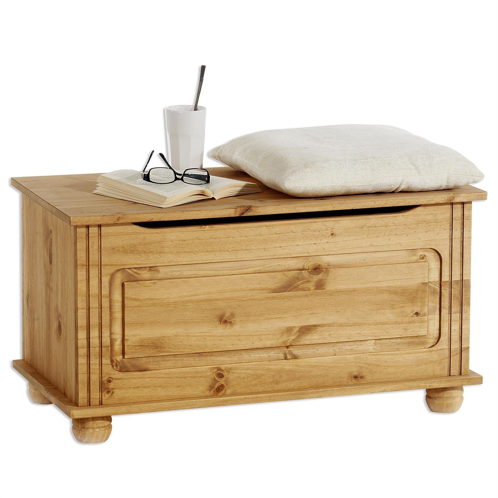ist vielseitig einsetzbar. Verstauen Sie kleine Decken und Kissen oder nutzen Sie es als Garderobenbank für Schals, Mützen und Taschen. Auch im Kinderzimmer findet diese Truhe ihren Einsatz z.B. für das Aufbewahren von Spielzeug oder ähnliches. Ein Klemmschutz beugt Verletzungen vor und die dekorative Optik mit den runden Kugelfüßen und den Verzierungen in der Vorderfront verleihen der Holztruhe ihren typisch rustikalen Landhaus Stil.