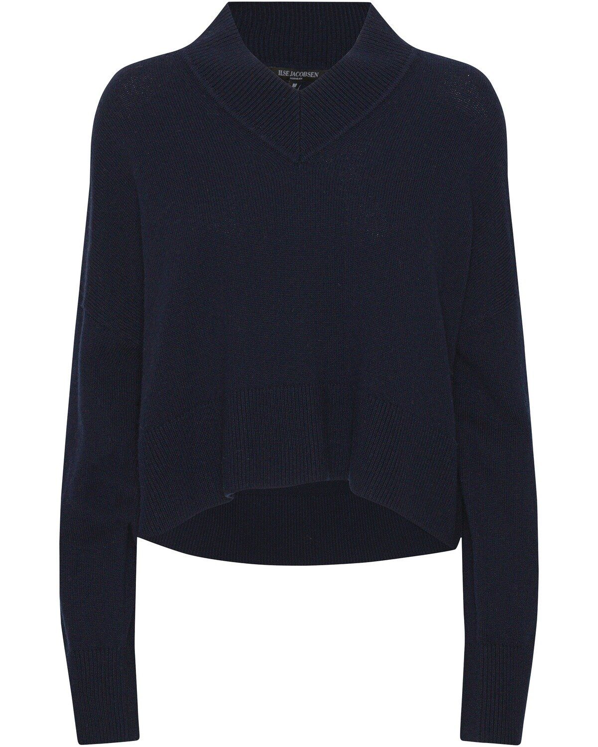 Etwas kürzer geschnittener Strickpullover von Ilse Jacobsen in legerem Schnitt mit Stehkragen, leichtem V-Ausschnitt, weit überschnittener Schulter sowie Rippenstrickbündchen an Saum, Ärmelenden und Ausschnitt. Das Modell besteht aus einer Zusammensetzung von Bio-Baumwolle, recycelter Baumwolle und feiner Merino-Lambswool. Oberstoff: 75% Baumwolle, 25% Schurwolle