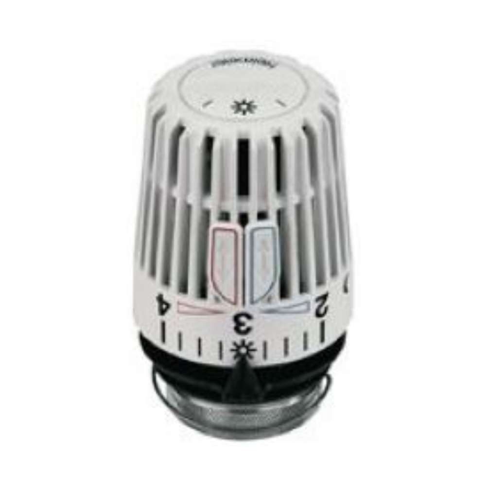 HEIMEIER Thermostatkopf K, eingeb. Fühler, Behördenausfg., weiß, 602000500 - HEIMEIER Thermostat-Kopf mit eingebautem Fühler und zwei Sparclips. Diebstahlsicherung durch Sicherungsring. Erhöhte Festigkeit nach abgelaufener Bundeswehrzulassung TL 4520-0014. Beanspruchungsgruppe 1 (für höchste Beanspruchung). Flüssigkeitsgefüllter Thermostat. Stabiles Regelverhalten auch bei kleinen Auslegungsregeldifferenzen (< 1 K). Entspr. EnEV bzw. DIN V 4701-10. Obere und untere Begrenzung bzw. Markierung des Temperaturbereiches oder Blockierung einer Einstellung durch zwei Sparclips. Verdeckte obere und untere Begrenzung des Temperaturberei- ches oder Blockier- ung einer Einstellung durch Anschlag- clips.Stirnseitige Ein- stellhilfe und erfühlbare Markierungen für Sehbehin- derte. Drehrichtungsanzeige und Symbole für Grundeinstellung und Nachtabsenkung. Kurzinformation mit den wichtigsten Einstellungen. Sollwertbereich 6 bis 28 Grd. C. Merkzahl 1-5. Frostschutzsicherung. Max. Fühlertemperatur: 50 Grd. C Hysterese: 0,15 K Wassertemperatureinfluß: 0,30 K Differenzdruckeinfluß: 0,20 K   Fabrikat: IMI Heimeier Typ: K Behördenausführung Skalenhaube: weiß RAL 9016   Art.-Nr. 6020-00.500HM602000500