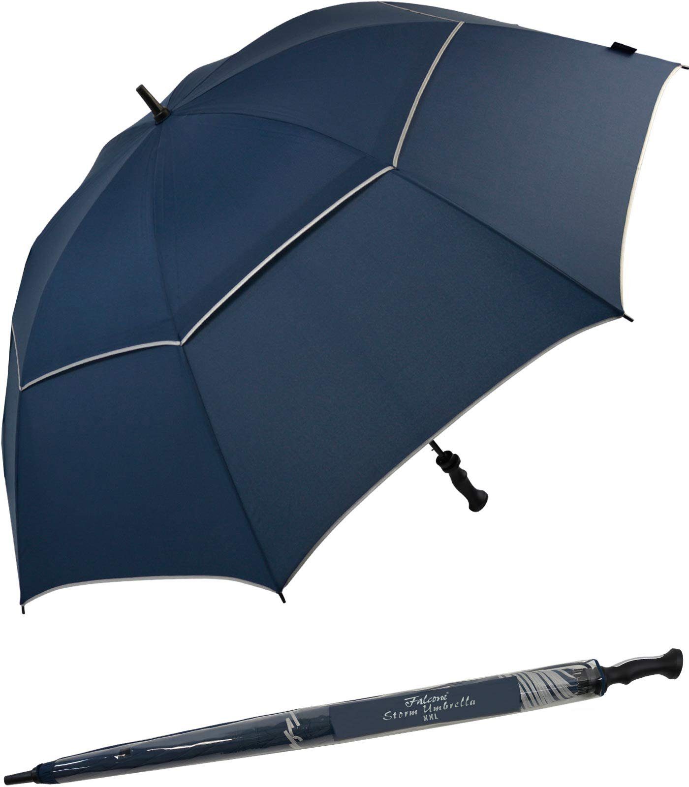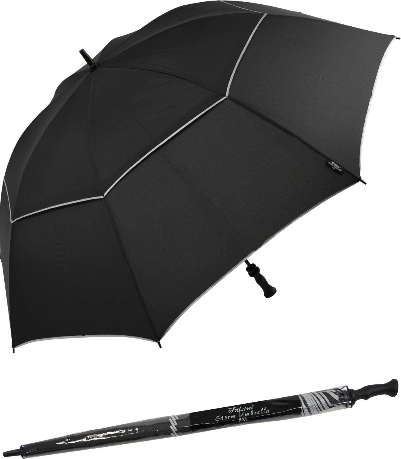 Dieser riesige, windfeste Golfschirm besitzt ein besonders innovatives Dach. Es ist aus zwei Teilen und einem Netzeinsatz gestaltet, so dass Wind den Schirm passieren kann, ohne ihn zu beschädigen. Selbstverständlich ist das Dach absolut dicht gegen Regen. Der Schirm ist dabei so groß, dass er problemlos zwei Personen vor Regen schützt. Die Farbe des Schirmdaches ist schwarz, das verwendete Material besteht aus 100% Polyester. Groß und stabil wiegt der Schirm nur ca. 944 Gramm. Geöffnet ist das Schirmdach 140 cm groß. Geschlossen misst der Regenschirm 110 cm. Geöffnet wird der Schirm manuell per Hand. Fiberglas in Stock und Gestell macht den Schirm stabil und flexibel und trotz seiner Размер sehr leicht. Zusätzlich sorgt der ergonomisch geformte Griff für guten Tragekomfort auch bei längerer Benutzung. Highlights setzen die silbernen Einfassbänder an den Rändern des zweiteiligen Daches, passend zum silberfarbenen Einsatz im Griff. Mitgeliefert wird eine Falcone® Storm Umbrella Hülle aus Kunststoff.