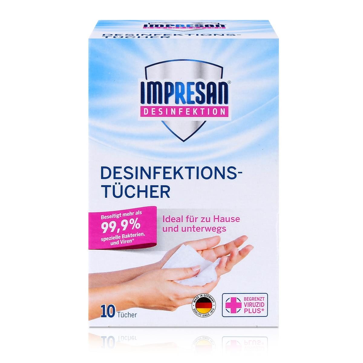 Im Lieferumfang enthalten: Impresan Desinfektions-Tücher 10 stk.Inhaltsstoffe | Desinfektionsmittel (100g Wirkstofflösung enthalten: 74g Ethanol), Duftstoffe |