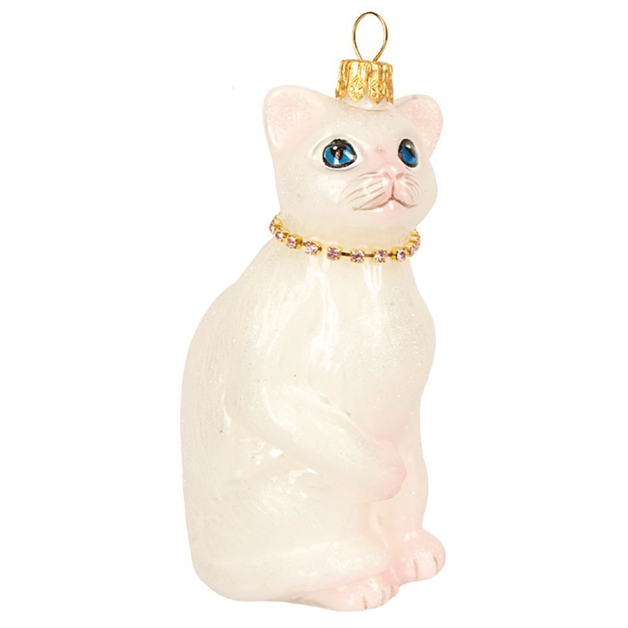PRODUKT: Weihnachtsbaum Anhänger Kätzchen mit Halsband / MATERIAL: Glas / GRÖSSE (HxBxL): ca. 10 x 5 x 4 cm / INHALT: 1 Christbaumfigur / FARBE: weiß