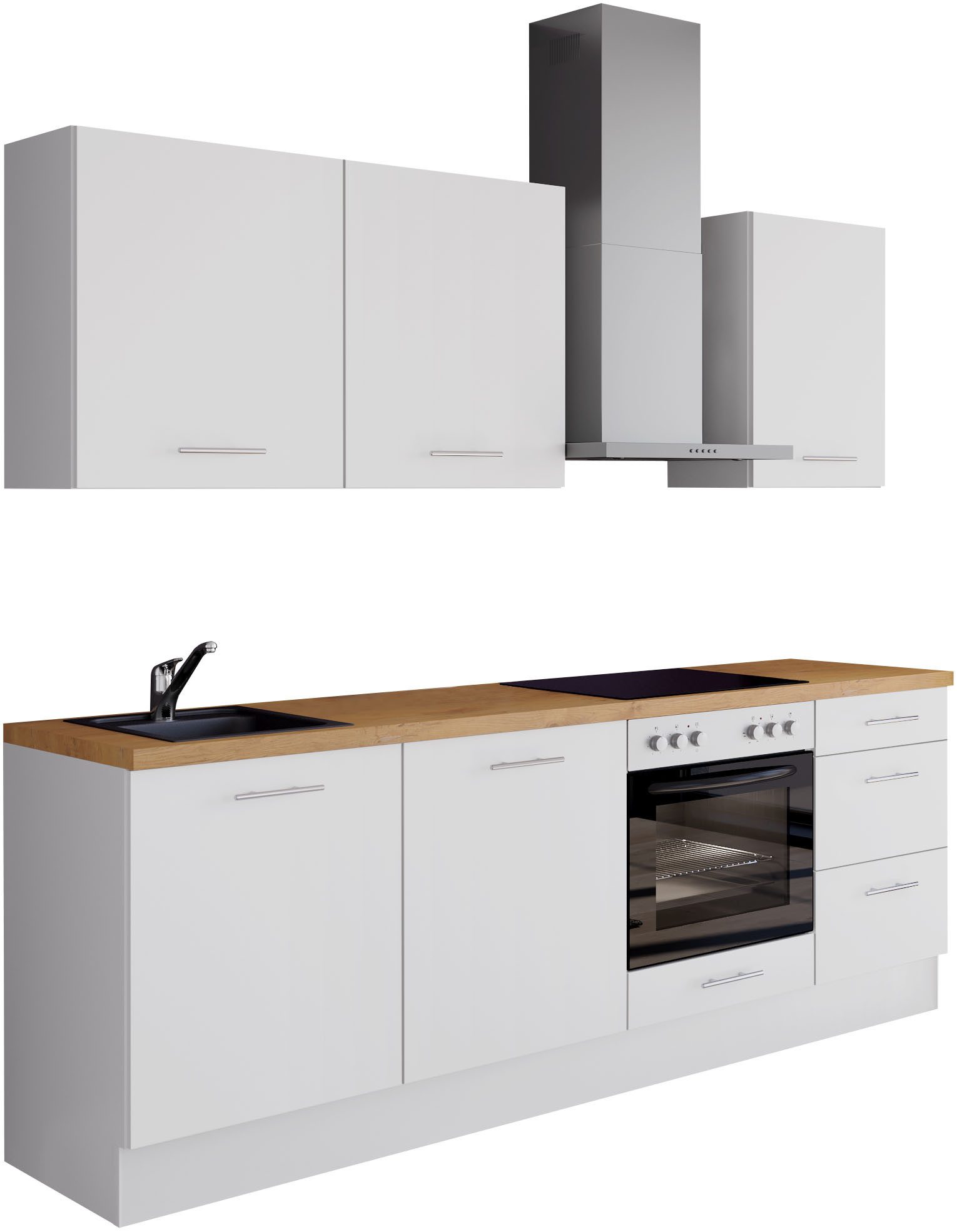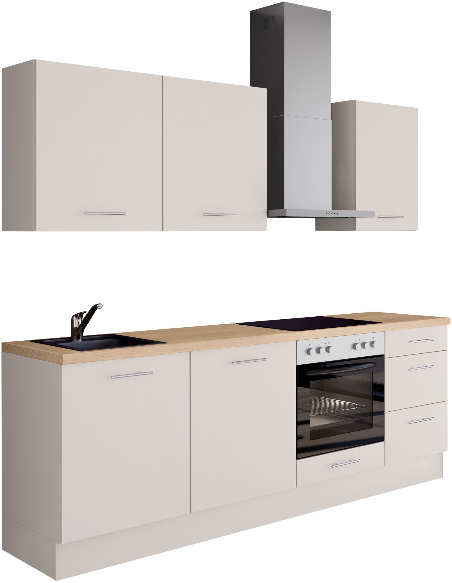 Set beinhaltet | Arbeitsplatte b: 220,2cm Hängeschrank 50cm Hängeschrank 60cm Sockel Spülen-Unterschrank 50cm Unterschrank für Einbauherde 60cm Unterschrank mit Schubkasten und zwei Auszügen 50cm |