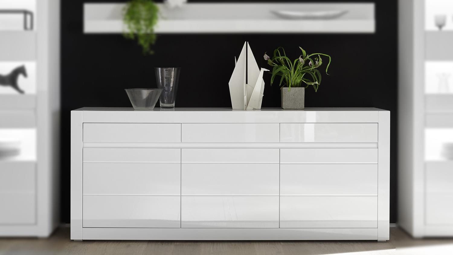 Das Sideboard CARAT beeindruckt mit seiner sensationellen Optik und seinen Qualitätsmerkmalen. Die moderne Kommode in weiß Hochglanz MDF bringt ein zeitloses Flair in Ihr Wohnzimmer. Hinter den drei Türen und in den drei Schubkästen mit Soft-Close Funktion haben Sie sehr viel Platz zum Verstauen. Ob Sie Absetzungen in weiß oder Beton Dekor wünschen, ist mit der Wechselleiste Ihnen überlassen. Kombinieren Sie diese Anrichte mit den anderen Möbeln aus dem Programm.