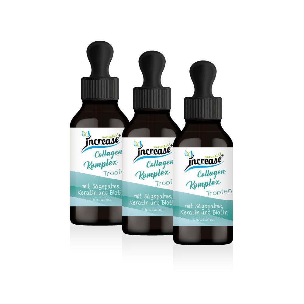 Collagen Tropfen ist ein Komplex pflanzlicher Rohstoffe mit einem hohen Gehalt an natürlichem Collagen, welches frei von chemischen Extraktionsprozessen gewonnen wird. Eine Tagesdosis enthält 5000 mg natürlichem Collagen. Pro Flasche sind 150.000 mg Collagen enthalten. Verzehrempfehlung: 2x täglich 1 ml einnehmen. Sie können Tropfen mit anderen Flüssigkeiten (Getränken) mischen. Die angegebene empfohlene tägliche Verzehrmenge darf nicht überschritten werden. Zutaten: MCT Öl, Collagen, Biotin, Keratin, Sägepalme, Lecithin. Inhaltsstoffe: 2 ml enthalten 5000 mg Collagen*, 10000 µg Biottin (20.000%)**, 1000 µg Keratin* und 50 mg Sägepalmenextrakt* (* keine NRV vorhanden / ** Prozent der NRV gemäls LMIV vorhanden) Hinweis: Nahrungsergänzungsmittel sollten nicht als Ersatz für eine ausgewogene, abwechslungsreiche Ernährung und gesunde Lebensweise verwendet werden. Außerhalb der Reichweite von Kindern lagern. Bitte kühl und lichtgeschützt lagern. 60 ml entsprechen je nach Bedarf 30 - 60 Portionen. Nettofüllmenge: 60 ml. Im Angebot enthalten sind 3 Packungen Increase Collagen Tropfen 60 ml zum Preis von 2 Packungen.