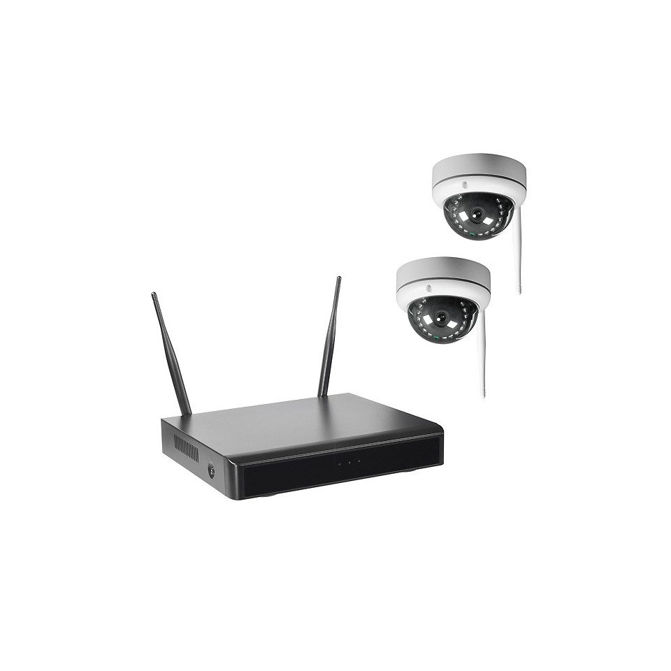 Full HD WLAN-Überwachungskameraset bestehend aus zwei 2MP-Kameras WR100D und Netzwerk-Videorecorder WR100R. Tag/Nacht-Kuppel-Kameras für innen oder außen (IP66) für Wand- und Deckenmontage, WLAN 802.11b/g/n, 1920 x 1080p (Full HD) bei bis zu 15 Bps., минимум Beleuchtung 0,1 Lux (Farbe) / 0,01 Lux (s/w) / 0 Lux (mit IR) mit 4mm Fix-Objektiv (horizontaler Erfassungswinkel 84°), Infrarot-Ausleuchtung (850nm) bis 15m, automatischem IR-Filteraustausch und 50cm Kabelpeitsche mit RJ45- und DC-Anschluss. Stromversorgung jeder Kamera 12 V DC über mitgeliefertes Steckernetzgerät mit 2,9m DC-Kabel. NVR mit integriertem WLAN Access Point mit 4-Kanal-Aufnahme in 1080p Full HD Auflösung (bis zu 15 Bilder/s pro Kanal) und Netzwerk-/ Internetverbindung. Bis zu 4 Kameras WR100B oder WR100D können über WLAN oder LAN eingebunden werden. Anschlüsse: 1x VGA, 1x HDMI, 1x RJ45. Automatische Aufnahme bei Bewegungserkennung mit 2 Sek. Voralarmaufnahme. Automatische Push- sowie E-Mail-Benachrichtigung bei Bewegungserkennung. Back-up über Netzwerk und USB-Anschluss. Smartphone-Zugriff auf Live-und Aufnahmebilder, Plug-and-Play-Einrichtung für App-/ PC-Software-Zugriff ohne feste IP-Adresse oder DynDNS. App für iOS und Android kostenlos erhältlich. Browserzugriff auf Livebilder über Internet Explorer. Inkl. einer speziell für die Videoüberwachung VORINSTALLIERTEN 4TB FESTPLATTE (bis zu 1x 6TB wird unterstützt), USB-Maus, Infrarot-Fernbedienung, 12 V DC Netzgerät, CD mit PC-Software (für MS Windows und iOS), zwei Warnaufklebern >Videoüberwachung< und einer externen Stabantenne mit 3m Kabel für eine Kamera. Recordergehäuse auch für die Wandmontage geeignet. Abmessungen: Ø 108 x 81mm (Kameragehäuse), 257 x 44 x 210mm (Recordergehäuse). Passendes Zubehör: Kamera WR100B, Kuppelkamera WR100D, WLAN-Repeater/Access Point WR100E, Antennen-Verlängerungskabel DWAK-3M sowie DWAK-6M.