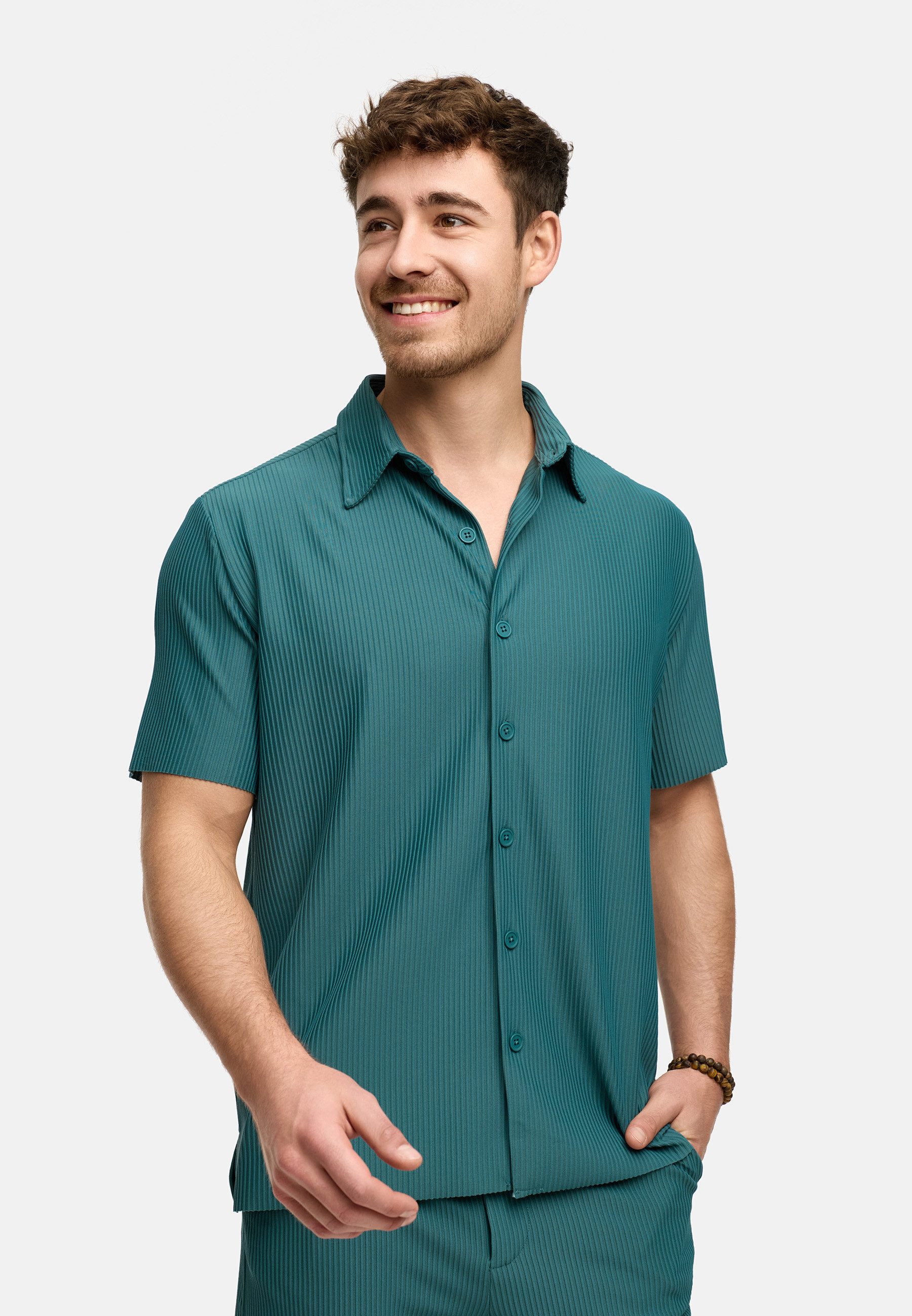 Das kurzärmelige Hemd besticht durch seinen lockeren, entspannten Schnitt und eine durchgehende Knopfleiste mit farblich passenden Knöpfen.
