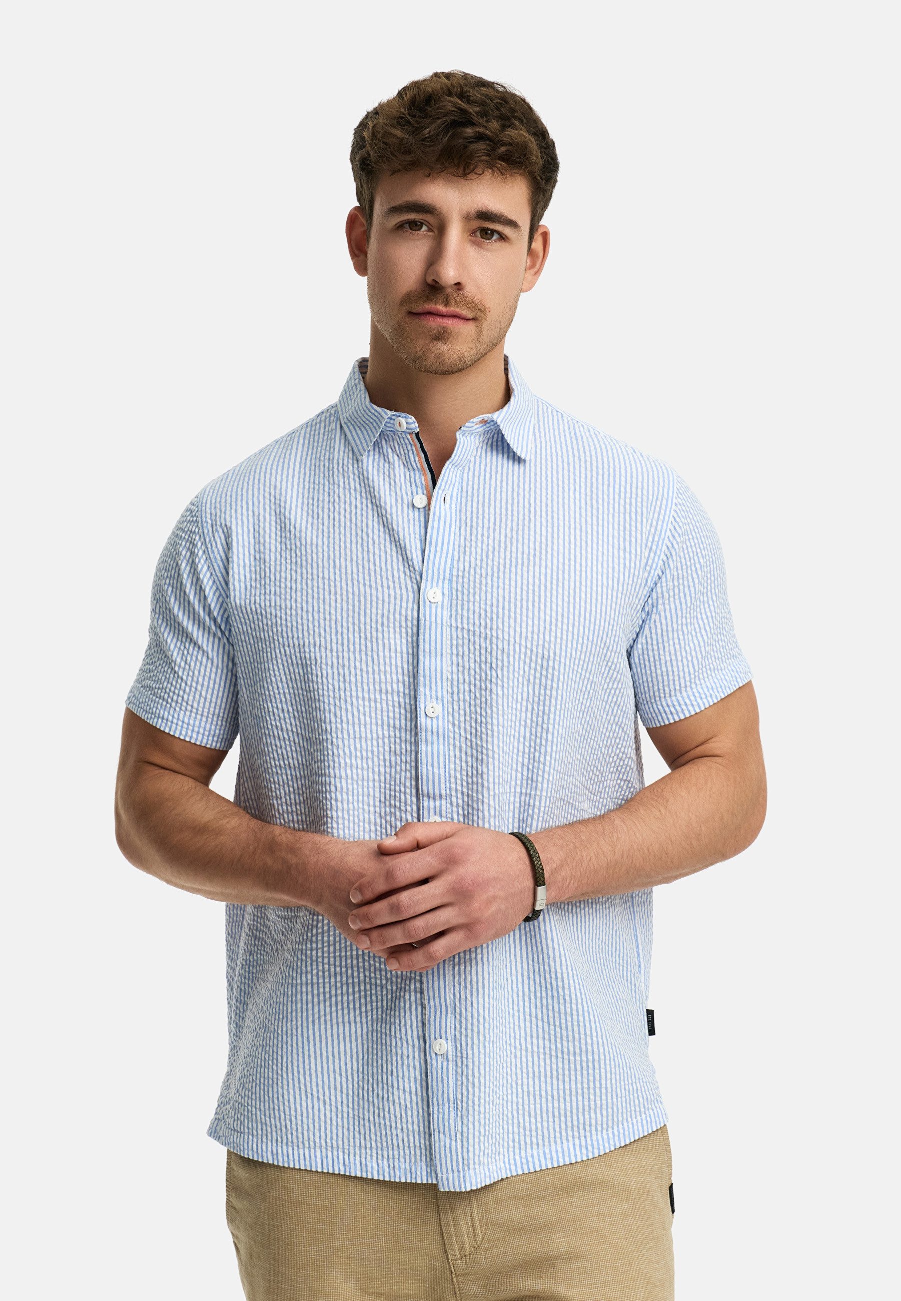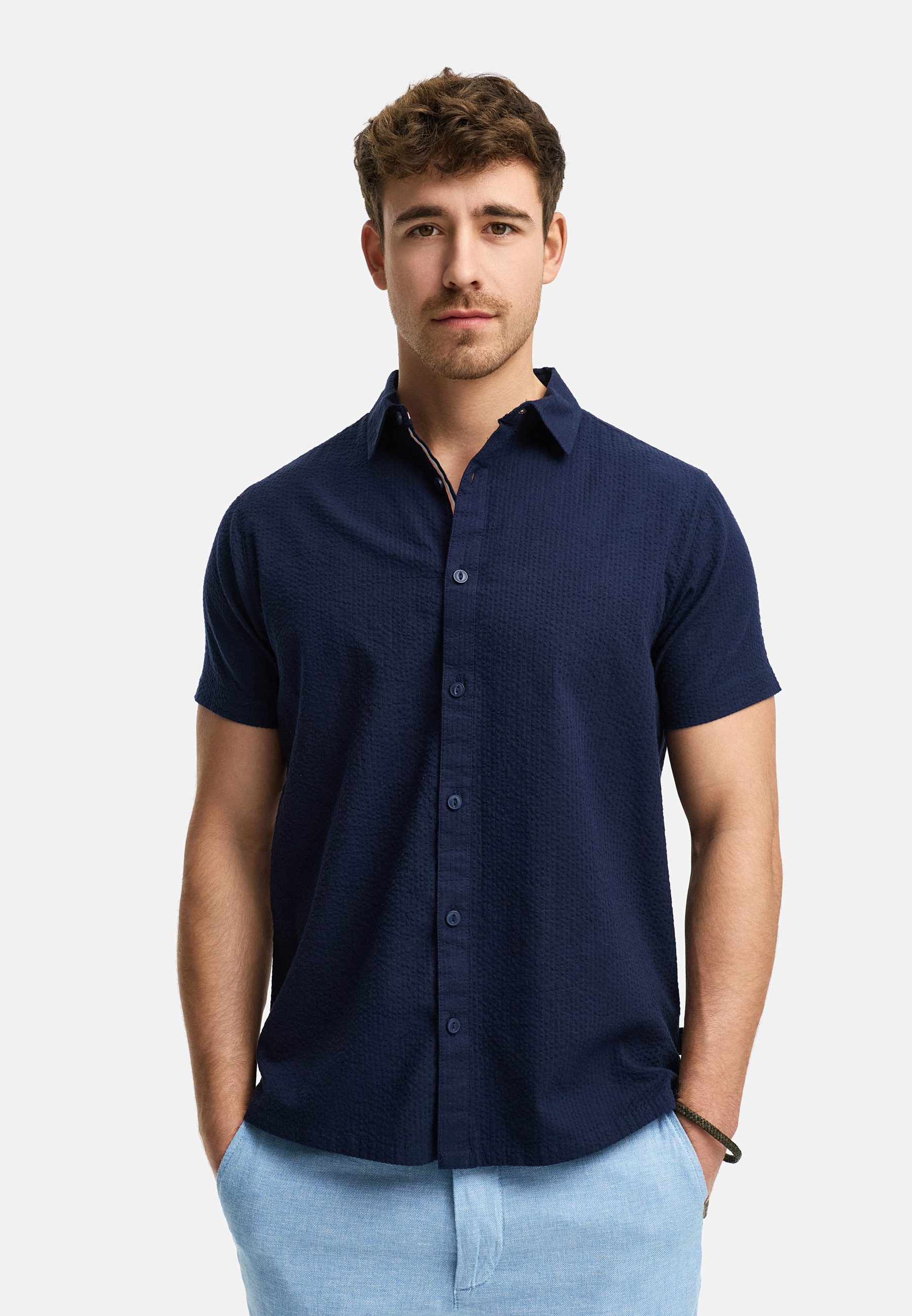 Dieses moderne Kurzarmhemd aus hochwertigem Seersucker bietet nicht nur eine stilvolle Optik, sondern auch ein außergewöhnlich angenehmes Tragegefühl. Die charakteristische strukturierte Oberfläche des Materials sorgt für eine leichte, luftige Haptik und verhindert, dass der Stoff direkt auf der Haut aufliegt – ideal für warme Tage. Das Hemd überzeugt mit einem klassischen Kragen, einer durchgehenden Knopfleiste und einer bequemen Passform, die sowohl Bewegungsfreiheit als auch einen gepflegten Look gewährleistet. Die dezente Struktur verleiht dem Design eine moderne Note, während der pflegeleichte Stoff knitterarm bleibt und somit auch perfekt für Reisen geeignet ist. Dieses Seersucker-Hemd ist ein Must-have für stilbewusste Männer, die auch an heißen Tagen nicht auf Komfort und Eleganz verzichten möchten!