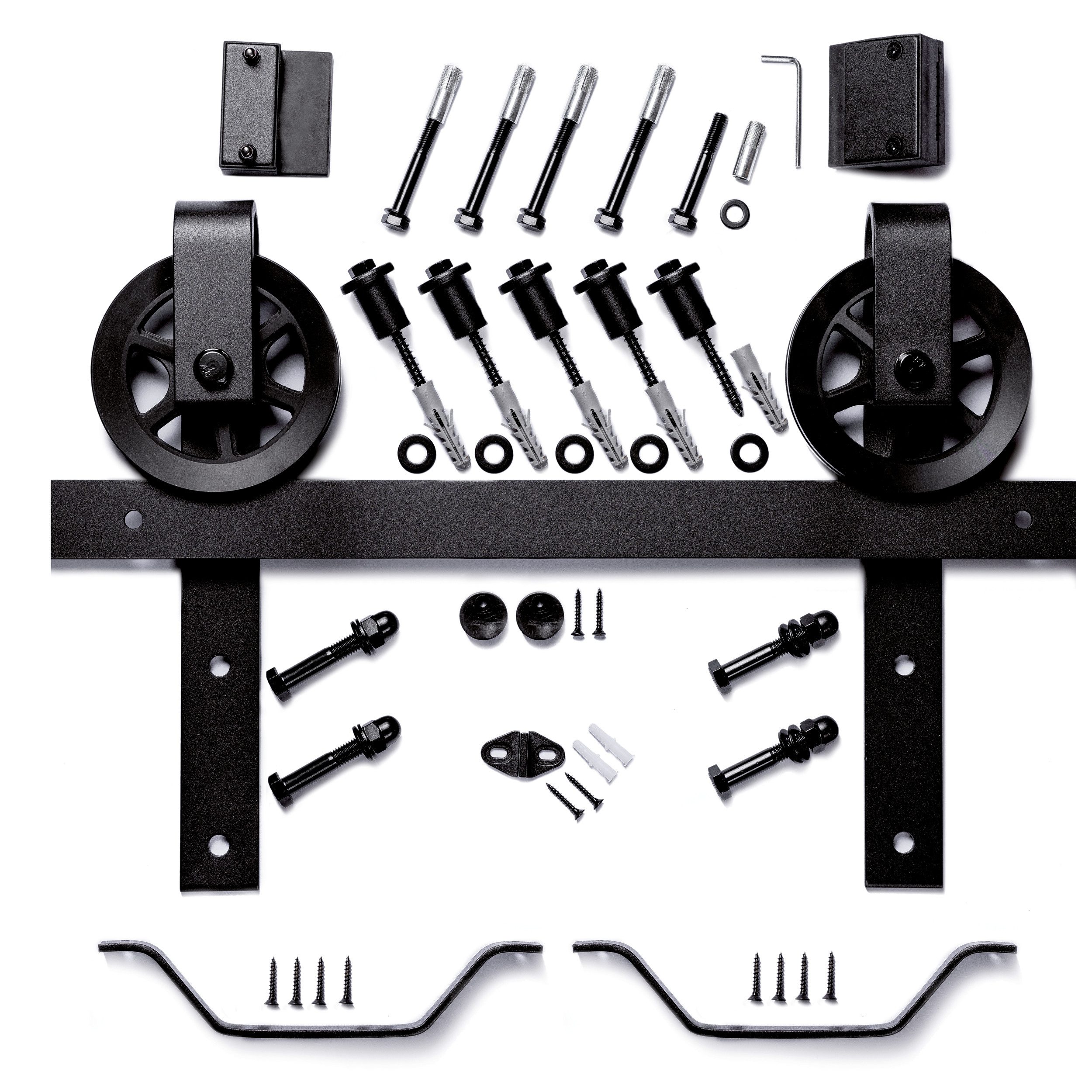 Lieferumfang | Schrauben, Dübel, 2 Laufräder, Laufschiene, Türstopper, 2 Türgriffe, Bodenlaufbolzen |