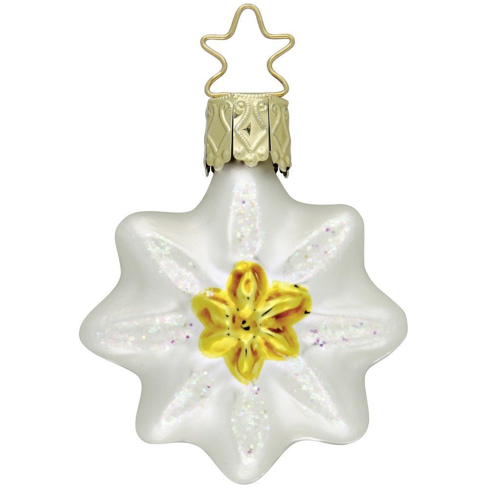 Weihnachtsbaumschmuck / Christbaumschmuck / Weihnachtsbaum Anhänger Blume Edelweiß Material: Glas - Größe: ca. 5,5cm - Packungsinhalt: 1 Figur - Farbe: weiß - gelb Kollektion: Bayerische Festzeit - Edelweiß - hübsche Weihnachtsbaumanhänger von INGE-GLAS MANUFAKTUR aus echtem Glas - in Deutschland mundgeblasen und handbemalt - lässt sich einfach an Zweigen, Ästen oder am Weihnachtsbaum befestigen Alpenblumen und Bayrische Heimatkultur am Christbaum: Dieser florale Weihnachtsschmuck bringt frische Stimmung in Ihre Weihnachtsdeko! Ob als Christbaumschmuck am Weihnachtsbaum, als dekoratives Element beim Verschönern der Festtafel oder an anderen Bäumen und Ästen - diese mit Glitzer verzierte Weihnachtskugel in Form der symbolreichen Bergblume bietet viele Dekorationsmöglichkeiten. Gestalten Sie Ihre individuelle Weihnachtsdekoration, indem Sie den blumigen Baumschmuck z.B. mit weiteren Weihnachtsbaumkugeln in Blumen - Form ergänzen oder mit anderen passenden Christbaumanhängern zum Thema Bayern kombinieren. Aber auch mit klassischen Christbaumkugeln und Weihnachtsbaumanhängern harmoniert die festliche Glas - Blüte und fügt sich sehr gut ins Gesamtbild. Als kleines Präsent ist der Deko – Anhänger ebenfalls hervorragend geeignet. Die Glasfigur ist eine originelle Geschenkidee, und nicht nur Blumenfreunde werden sich über diesen lieblichen Weihnachtsbaumschmuck freuen. Figur & Thema: Alpenblume, Gebirgsblume, Wildblume, Blumen & Blüten, Pflanzen, Natur, Symbol, Allgäu, Alpenland, bayerische Alpen, Bayern, typisch bayrisch, Oktoberfest, Wiesn - Stil & Aufmachung: elegant, stilvoll, edel, bayerisch - Als Geschenk oder Mitbringsel an Weihnachten für: Blumenliebhaber, Floristen, Gärtner & Gärtnerinnen, Hobbygärtner, Gartenfreunde, Naturliebhaber, Naturfreunde, Bayern & Bayerinnen, Bayernliebhaber, Wiesngänger, Wiesn-Fans Die Farben können aufgrund von unterschiedlichen Monitor Einstellungen vom Foto leicht abweichen