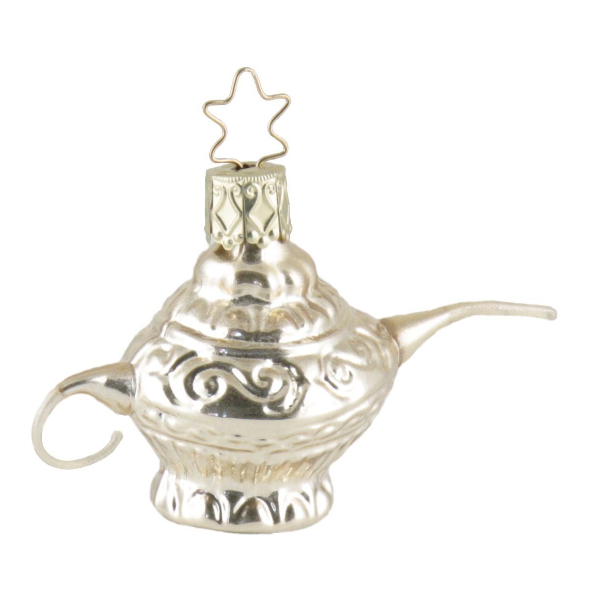 INGE-GLAS Weihnachts-Hänger Wunderlampe Dies ist keine Öllampe aus einer magischen Höhle, die einst Aladin half die schöne Tochter des Sultans zu heiraten, da der befreite Dschinn seine Wünsche erfüllte - aber märchenhafte Weihnachten zaubert dieser filigrane Anhänger aus dem Hause Inge-Glas in jedem Fall. Material: in Deutschland mundgeblasenes Glas Maße gesamt: ca. 6 x 3,5 x 8 cm (HxBxL) Длина Aufhänger: ca. 2 cm Hinweis: Dies ist ein "fünfzackiges Sternkrönchen"-Produkt. Das bedeutet, dass dieser Anhänger in Deutschland in den Werkstätten von INGE-GLAS in Neustadt bei Coburg hergestellt wurde. Die Familie Müller-Blech fertigt seit 1596 in der 14. Generation. Das Sternkrönchen ist seit 1987 eingetragenes Markenzeichen und steht für höchste Qualität und fortlebende Tradition des handgefertigten Glas-Christbaumschmucks. Dieses Angebot gilt für ein Stück Christbaumhänger Wunderlampe, von Inges Christmas Decor GmbH, Artikel IG-10135S018, OHNE Deko oder sonstigem Zubehör.