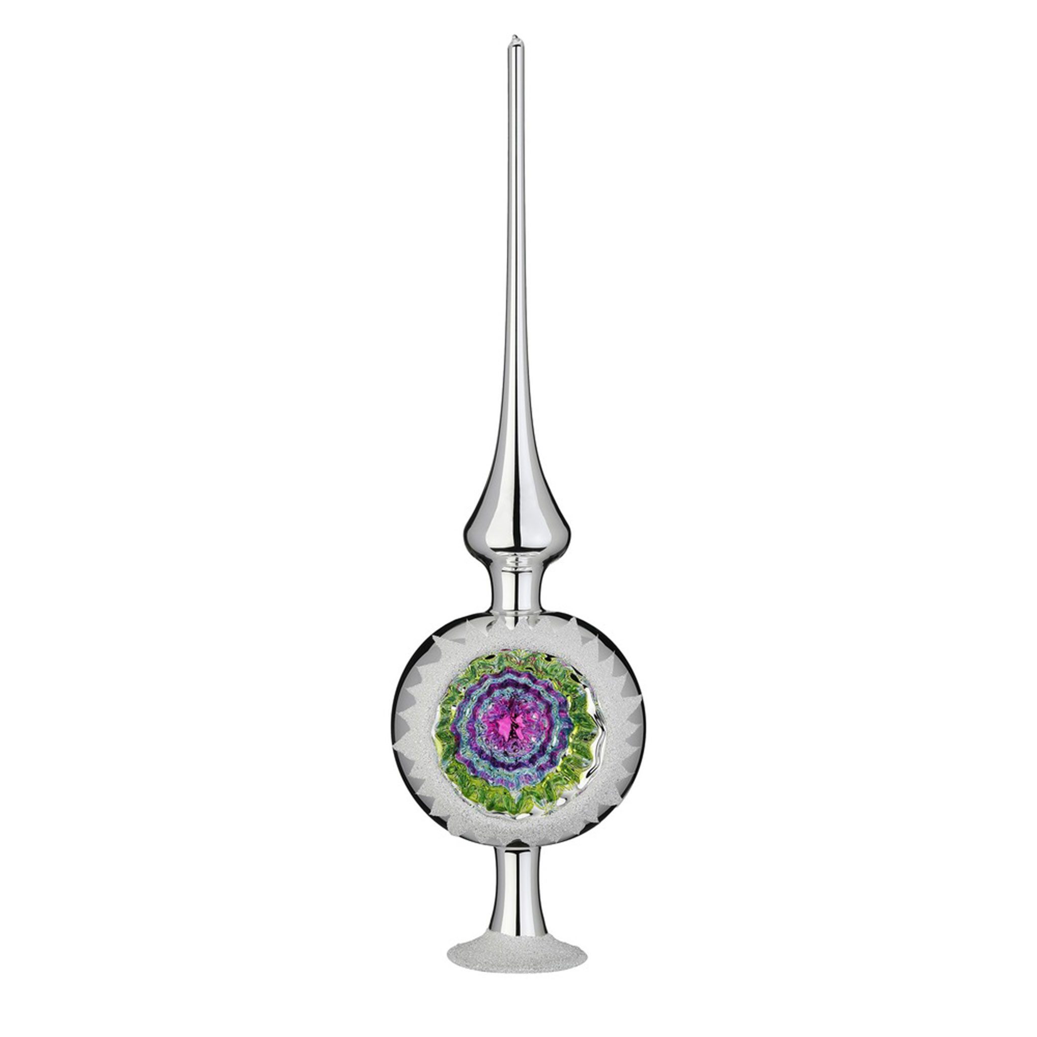 PRODUKT: Weihnachtsspitze "Ornament Reflex" Glanz / HÖHE: ca. 36 cm / MATERIAL: Glas / INHALT: 1 Spitze / FARBTON: silber - grün - blau - pink