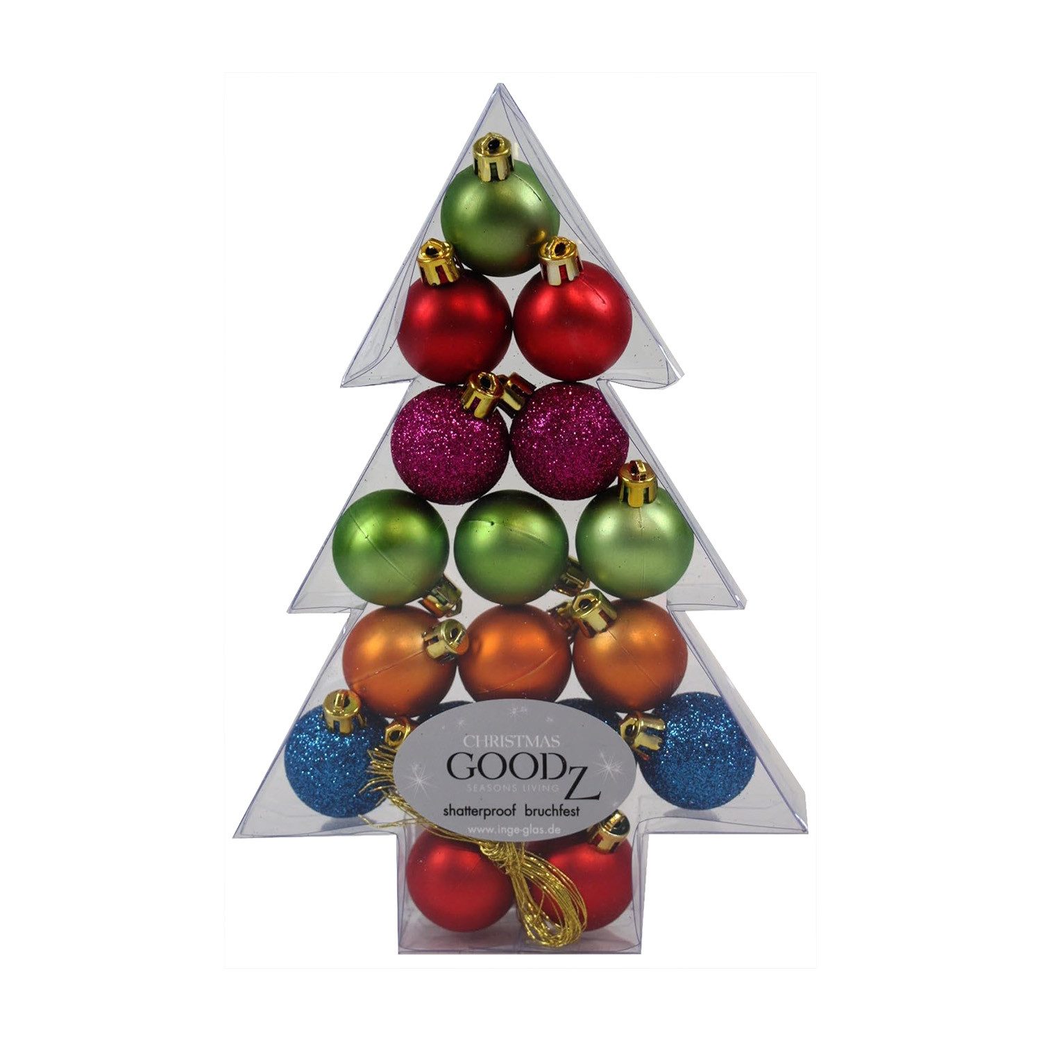 Die Inge-Glas Weihnachtskugeln MilleFiori im praktischen Mini-Format bringen bunte Vielfalt an deinen Weihnachtsbaum. Das 17er-Set besteht aus kleinen Kugeln mit 3 cm Durchmesser und eignet sich ideal für Mini-Bäume, Adventskränze, Tischdekorationen oder Fensterdekorationen. Das farbenfrohe MilleFiori-Design sorgt für lebendige Akzente im klassischen Tausend Blumen-Look. Die bunten Muster schaffen eine verspielte, fröhliche Atmosphäre und lassen sich hervorragend mit einfarbigen Kugeln oder Naturmaterialien kombinieren. Die Kugeln bestehen aus bruchsicherem Kunststoff, sind leicht und sicher perfekt für Haushalte mit Kindern oder Haustieren. Jede Kugel verfügt über eine stabile Aufhängeöse und kann schnell am Baum oder Kranz befestigt werden. Ob für den kleinen Weihnachtsbaum, für Zweige in der Vase, als Streudeko auf dem Tisch oder als origineller Geschenkanhänger die MilleFiori Mini-Kugeln von Inge-Glas sind vielseitig einsetzbar und bringen bunte Weihnachtsfreude in jedes Zuhause.