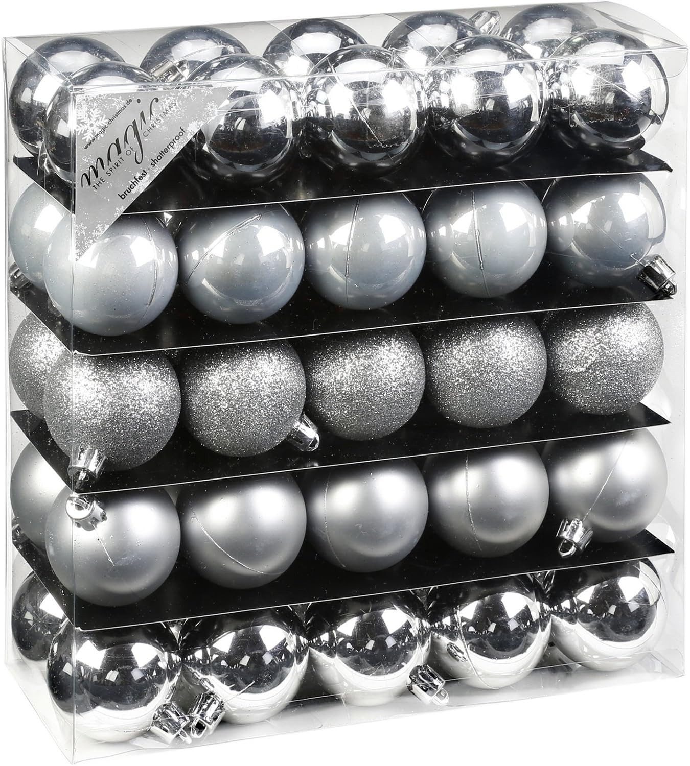 Die Inge-Glas Weihnachtskugeln Silber bringen edlen Glanz an deinen Weihnachtsbaum. Das Set besteht aus 50 bruchsicheren Kunststoff-Kugeln mit einem Durchmesser von 5 cm ideal für mittelgroße und große Bäume sowie für Kränze, Fensterdeko oder festliche Tischdekorationen. Die Kugeln sind in einem harmonischen Mix aus glänzenden und matten Oberflächen gestaltet und sorgen so für eine abwechslungsreiche, elegante Optik. Das zeitlose Silber lässt sich hervorragend mit anderen Farben wie Rot, Blau oder Gold kombinieren oder als klassisches Dekor allein verwenden. Durch die robuste Kunststoff-Verarbeitung sind die Kugeln bruchsicher, leicht und langlebig perfekt für Haushalte mit Kindern oder Haustieren. Jede Kugel verfügt über eine stabile Aufhängeöse für eine schnelle und einfache Befestigung. Egal ob am Christbaum, im Adventsgesteck oder als Tischschmuck dieses Kugelset bietet vielseitige Möglichkeiten für deine Weihnachtsdekoration. Inge-Glas steht seit Generationen für stilvolle Weihnachtsartikel mit Qualität.