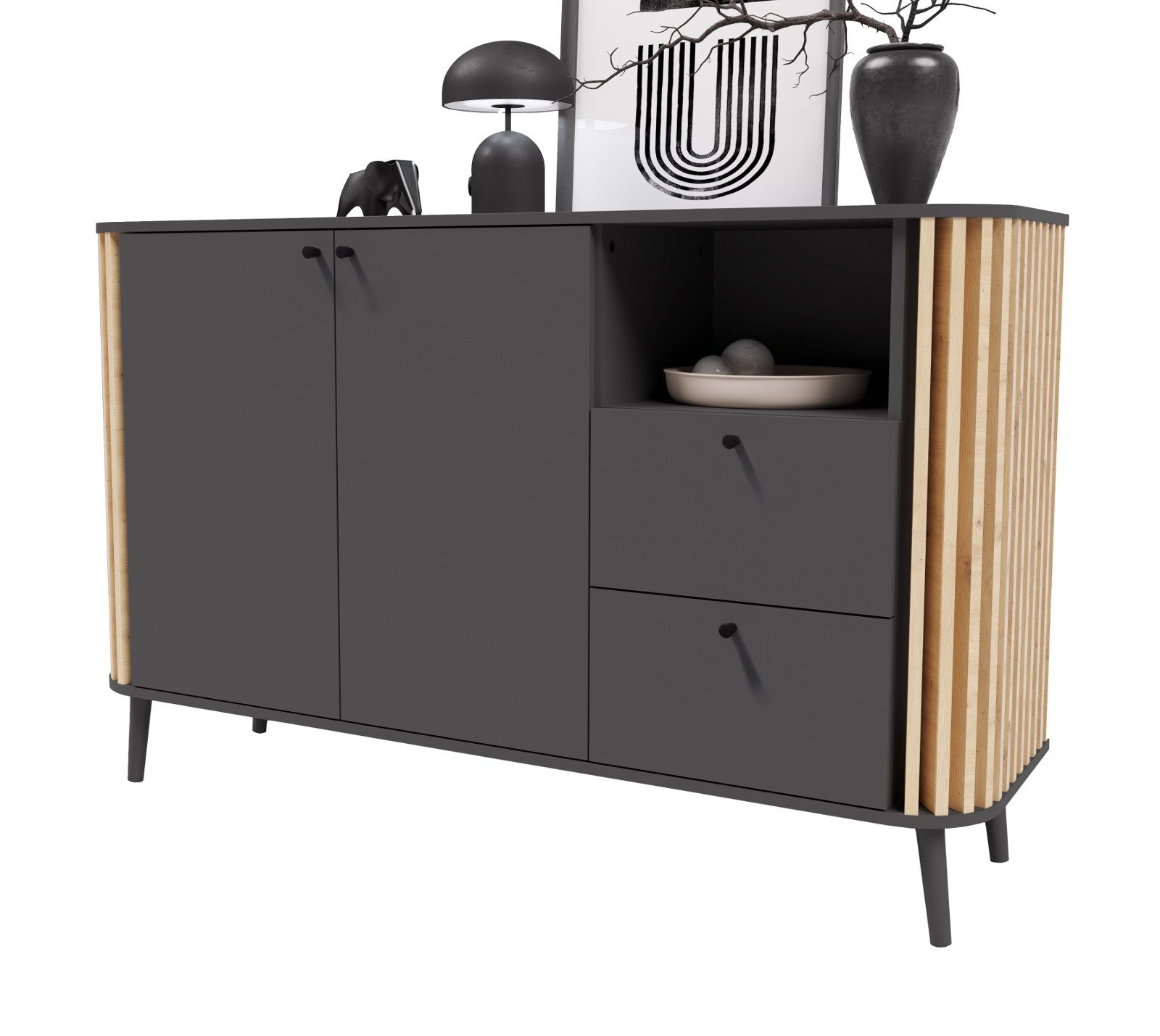 Ausstattung | Mit 3D-Lamellen Türen und Schubladen Metallgriffe |