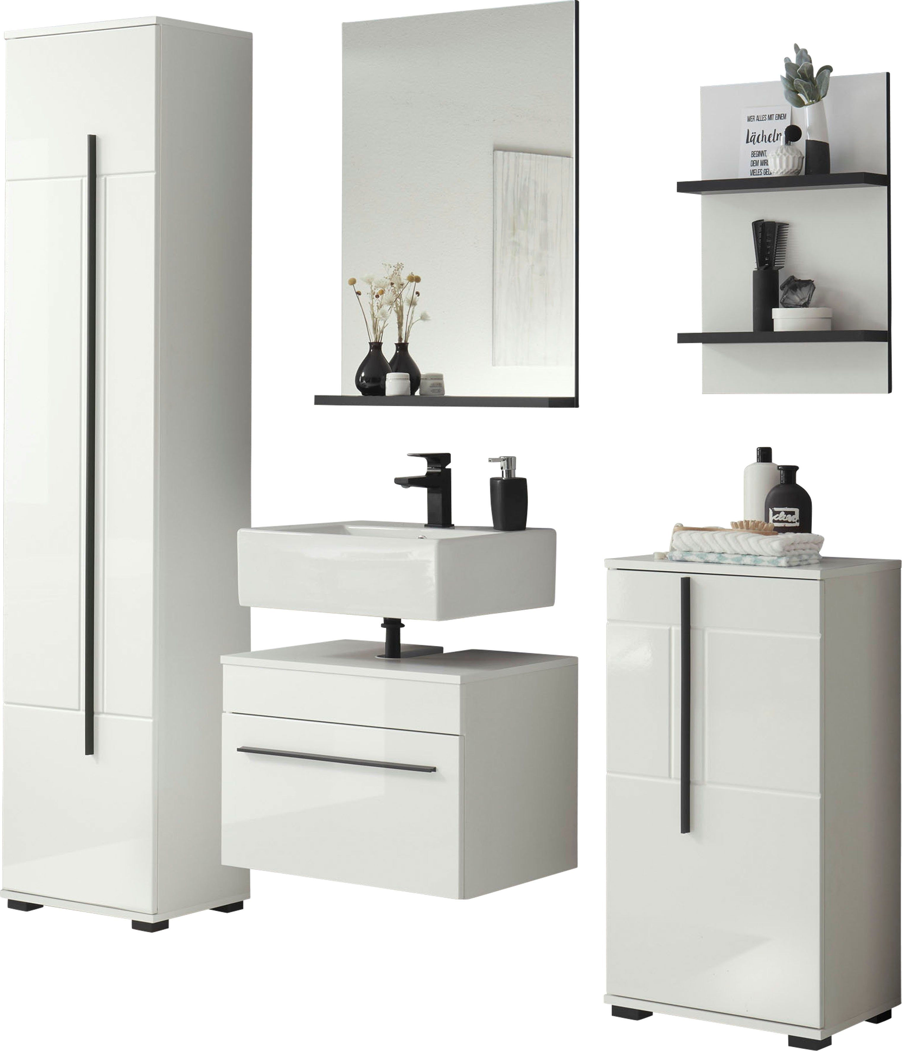 INOSIGN Badmöbel-Set Cantara, Bad im modernen Design, 5-teiliges Badezimmer, (Set, 5-St), Unterschrank, Schränke, Hängeregal und Spiegel, in Weiß Hochglanz