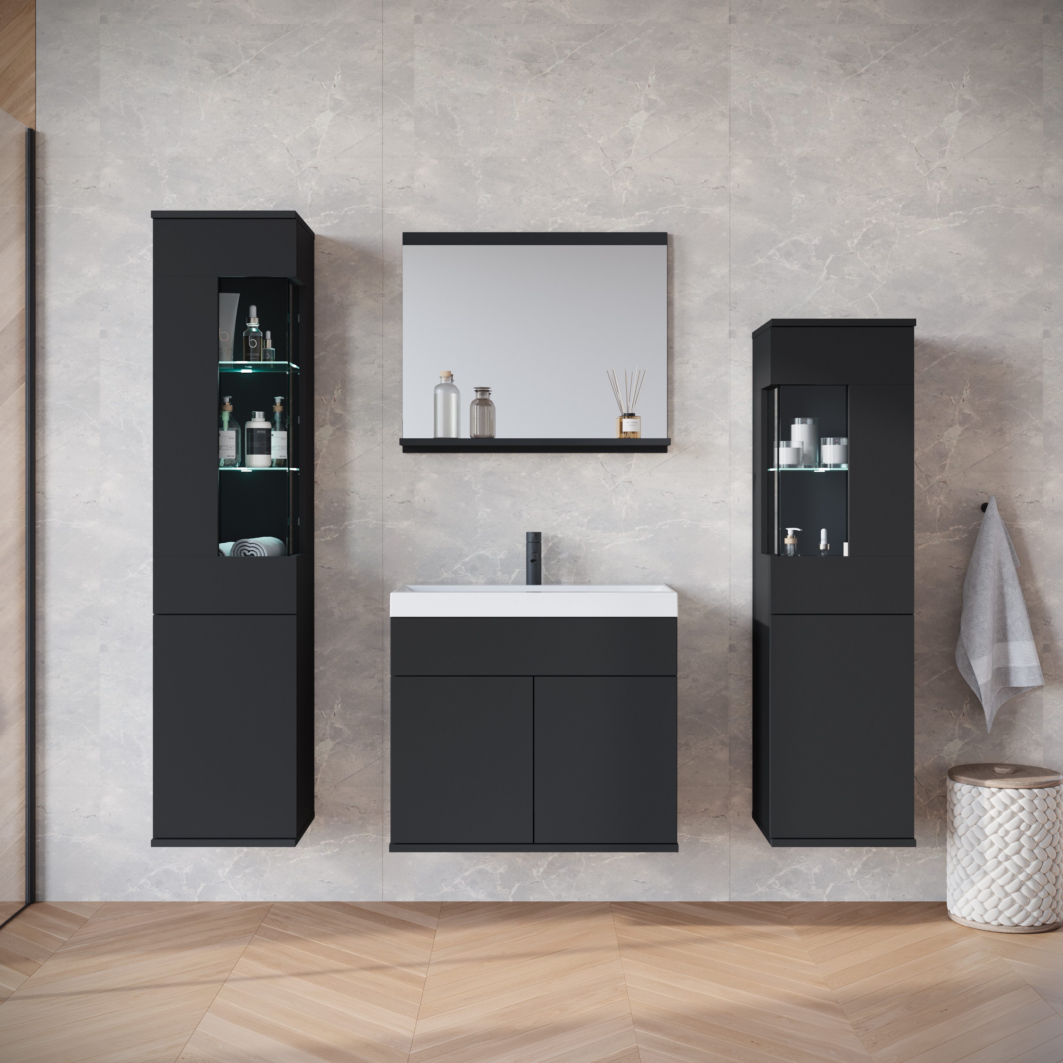 Set beinhaltet | 1 Waschtisch, 2 Hängeschrank, 1 Spiegel mit Ablage |
