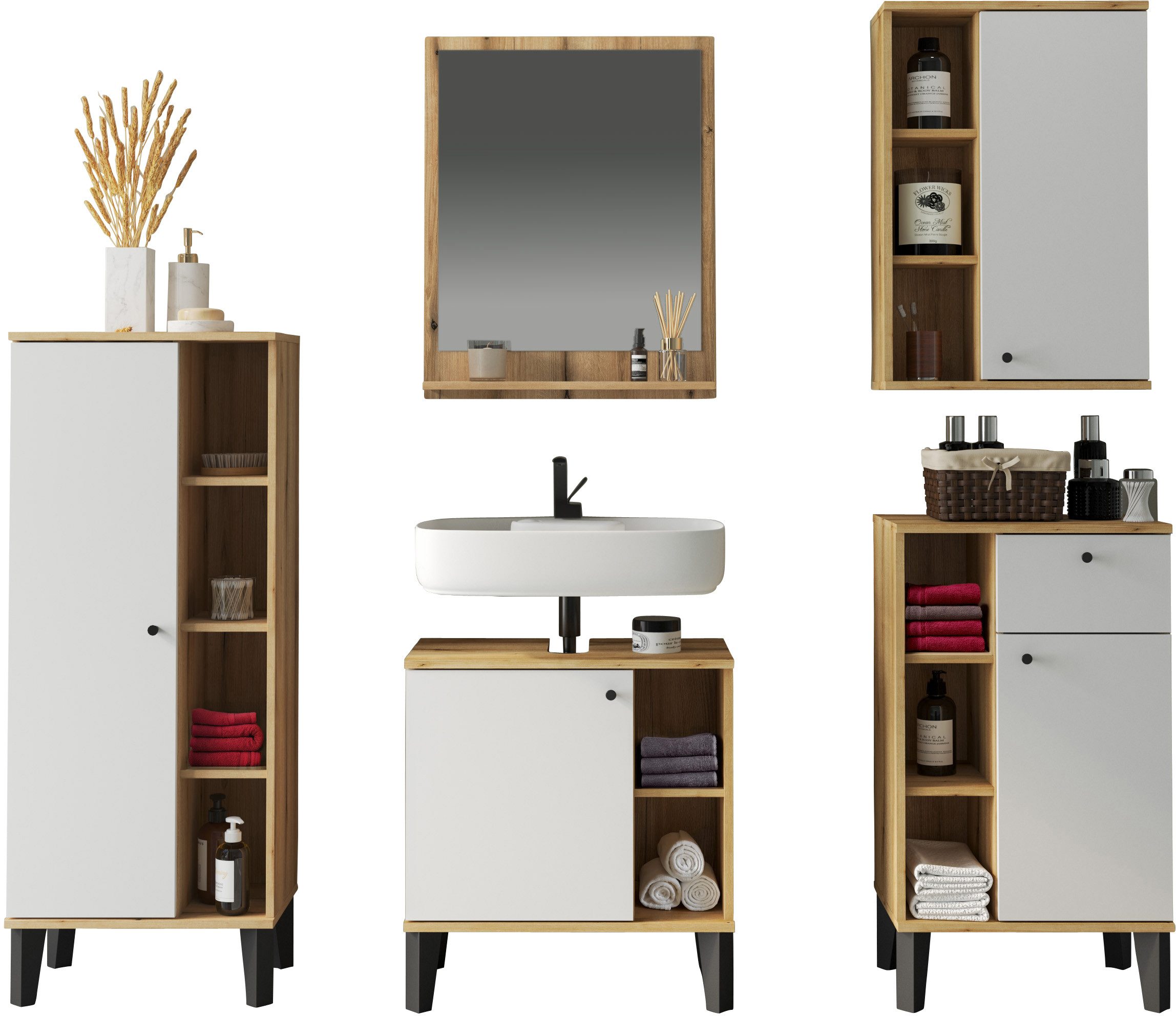 Set beinhaltet | 2x Badschränke, 1x Badhängeschrank, 1x Waschbeckenunterschrank, 1x Spiegel |