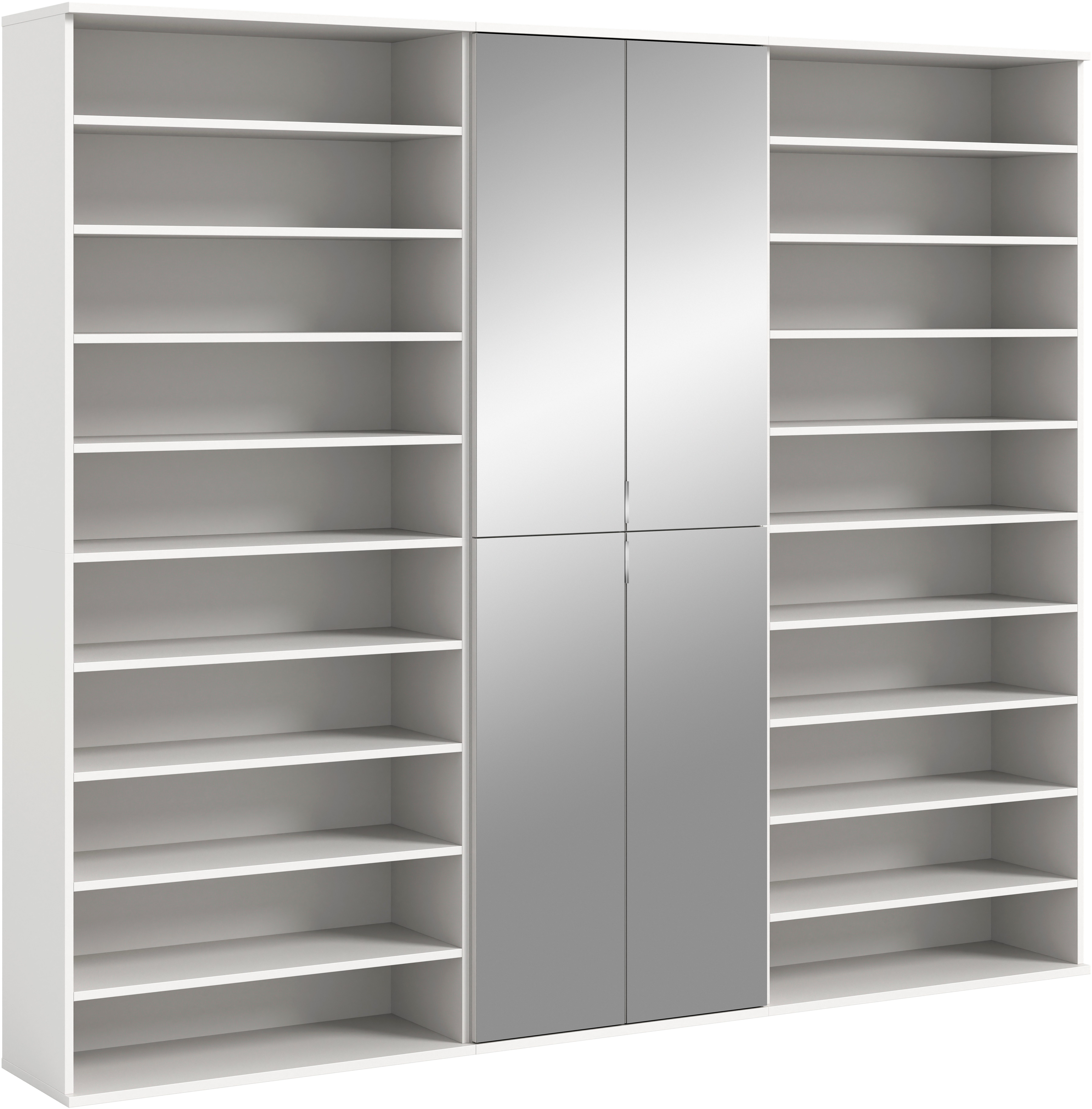 Ausstattung Schrank | 4 Spiegeltüren 7 Einlegeböden 9 Fächer |