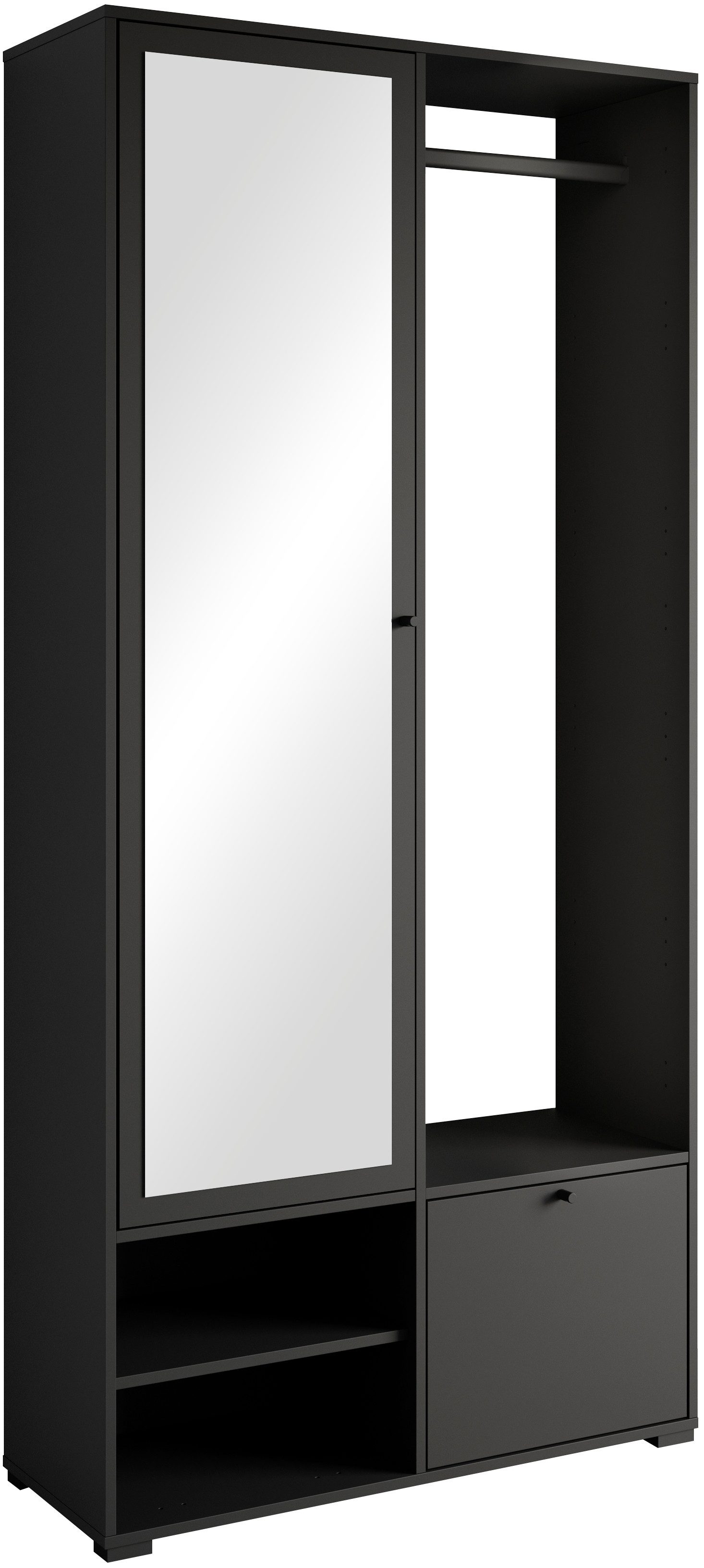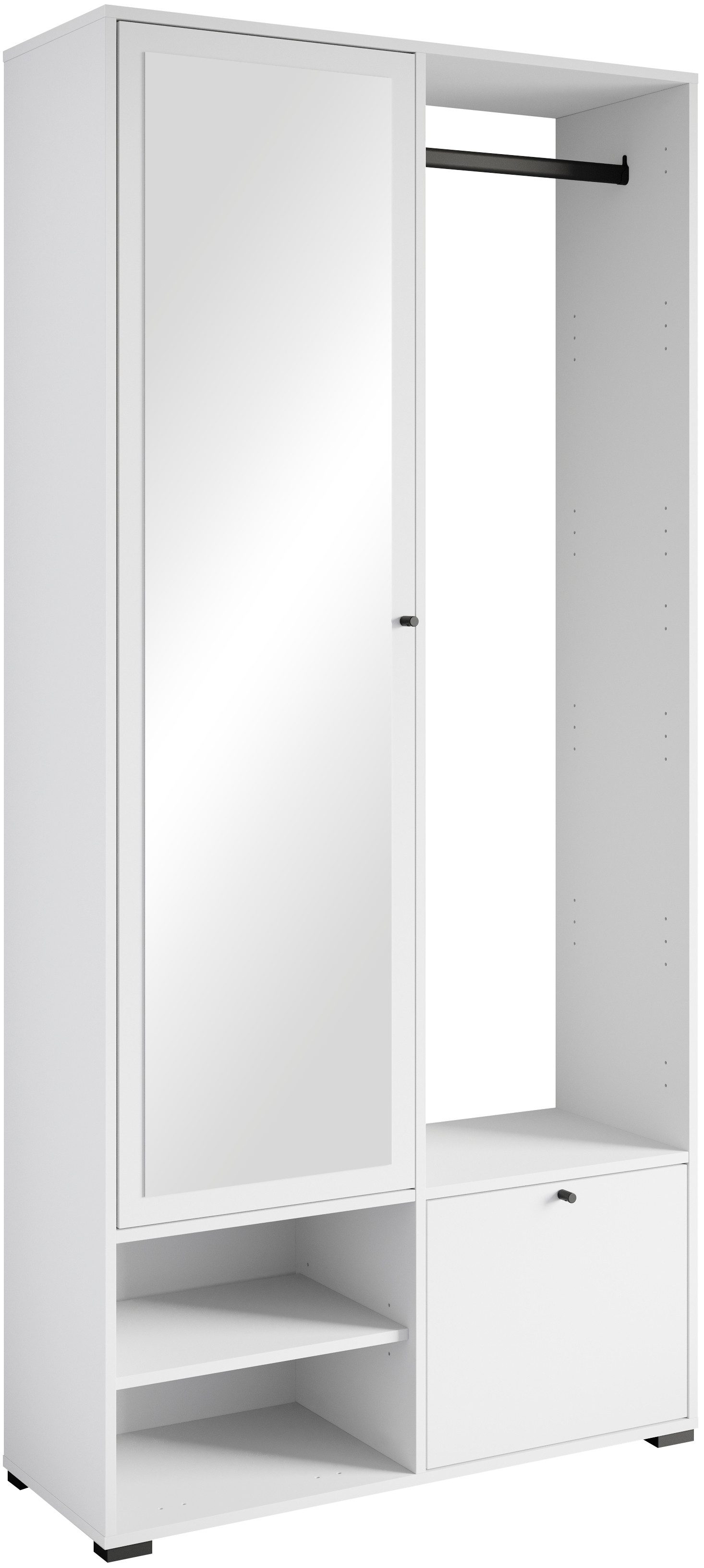 Dieser Kleiderschrank »DINO Kompaktgarderobe, Garderoben-Set DINO« von INOSIGN ist ein Allrounder im Schlafzimmer. Er schützt deine Kleidung vor Staub und fungiert gleichzeitig auch als großer Spiegel. Die Öffnungsrichtung kannst du nach Belieben festlegen, da der Türanschlag sowohl rechts als auch links angebracht werden kann. Die Einlegeböden sind teilweise variabel einsetzbar. So kannst du selbst über die Höhe der einzelnen Fächer bestimmen. Bei Möbeln, die viel in Gebrauch sind, ist es sinnvoll, die Kanten zu schützen. Das geschieht bei diesem Modell durch die Verkleidung mit sogenannten ABS-Schutzkanten. Der harte Kunststoff macht den Schrank unempfindlich gegen Stöße und Rempler. Die maximale Belastbarkeit liegt bei einem Gewicht von 48 Kilogramm. Hergestellt wurde das Produkt in Polen.