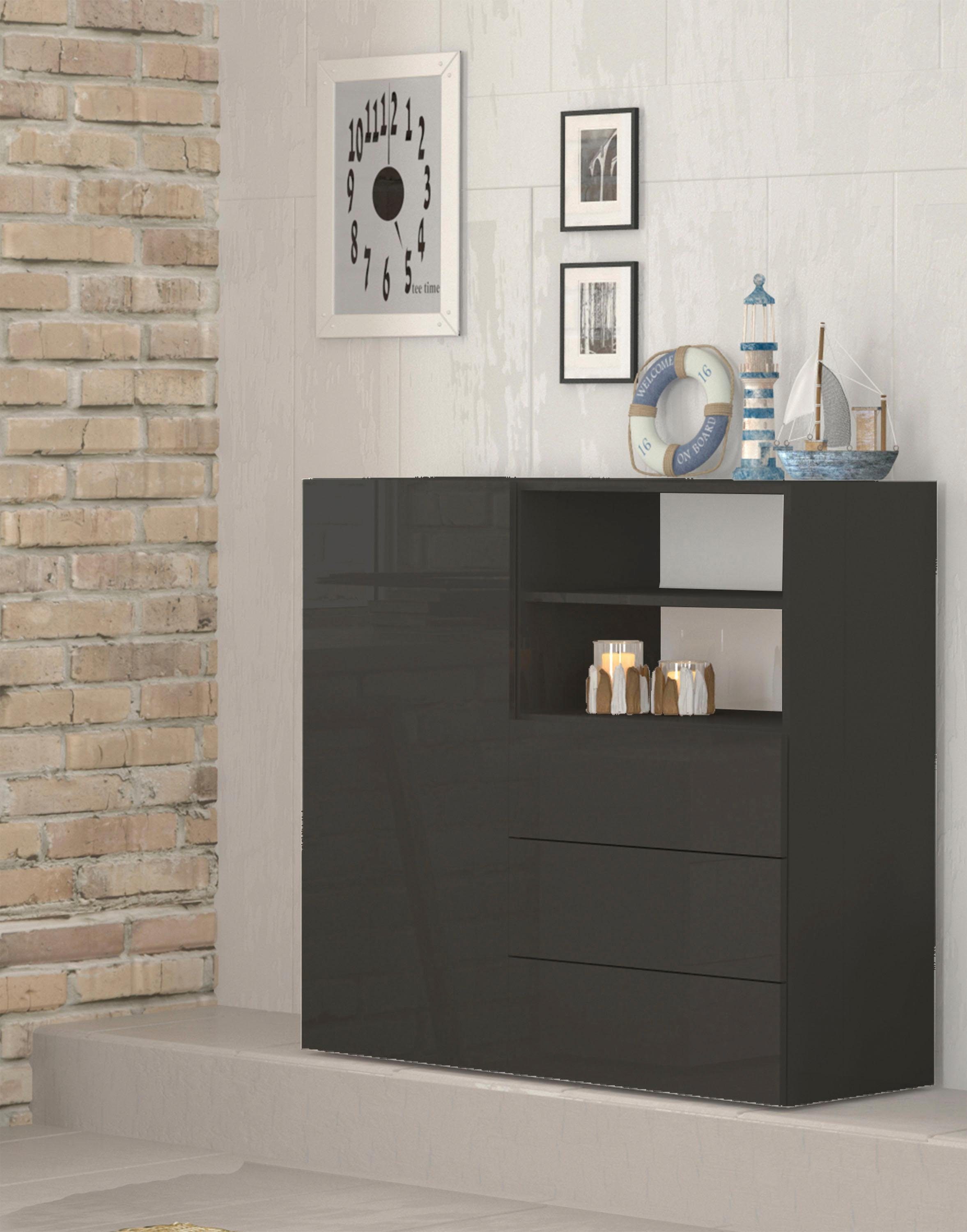 Wissenswertes | Highboard aus Programm Metis,aus FSC®-zertifiziertem Holzwerkstoff in drei Farbausführungen : Komplett weiss Hochglanz lackiert,komplett anthrazit Hochglanz lackiert, komplett türkis Hochglanz lackiert,links eine Holztuer, rechts zwei offene Fächer (Fachinnemaßbe je B/T/H 57,5/35/17-18) und drei Schubkästen. Gesamtmaße B/T/H 110/40/102 cm. In folgenden Farben erhältlich: