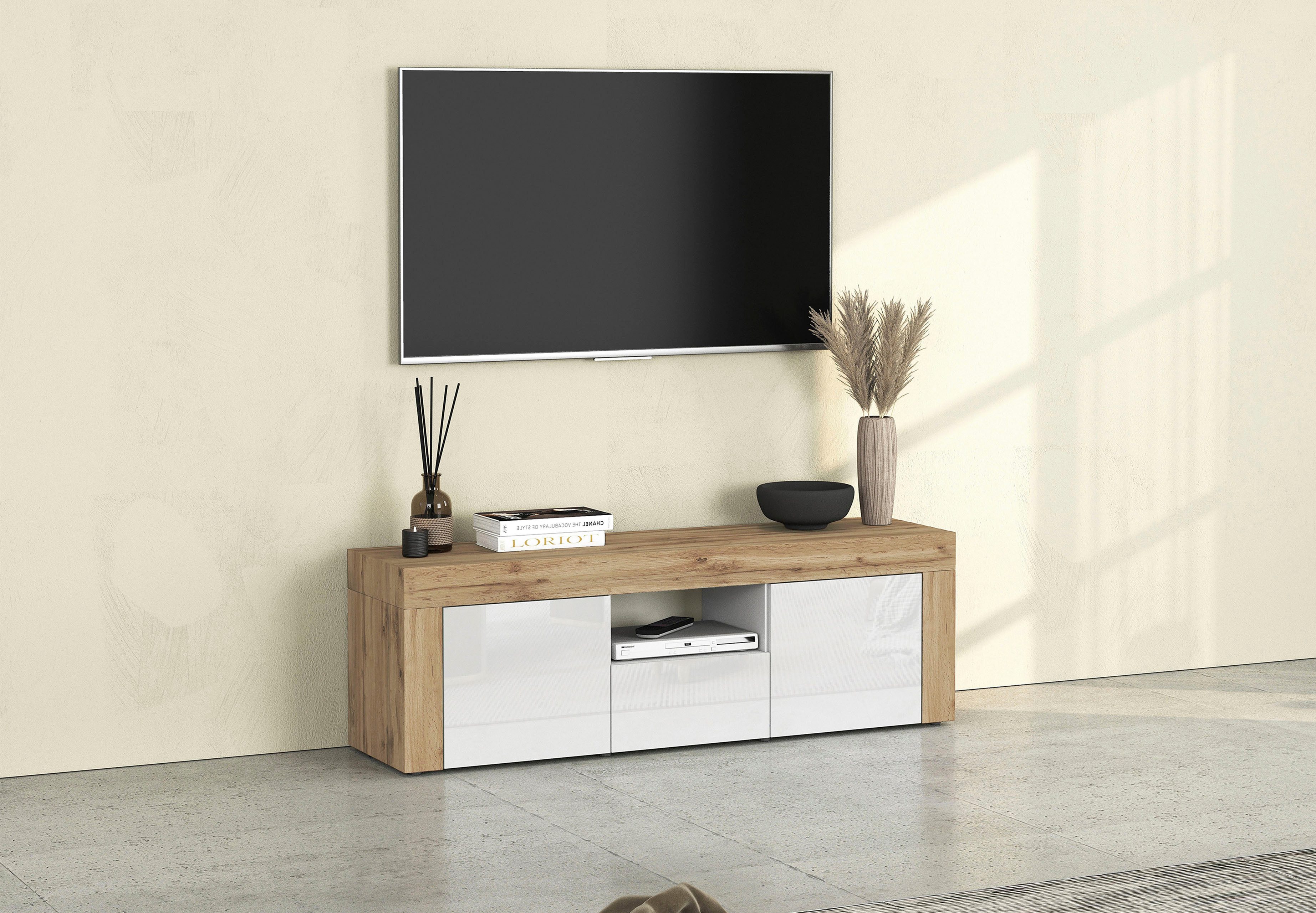Aus Holzwerkstoff hergestellt, erhält der TV-Schrank eine besonders stabile Struktur. Getragen wird der TV-Schrank von Gleitern. Sie sorgen dafür, dass der Boden nicht zerkratzt wird. Die maximale Belastbarkeit liegt bei einem Gewicht von 50 Kilogramm. Hergestellt wurde das Produkt in Italien.