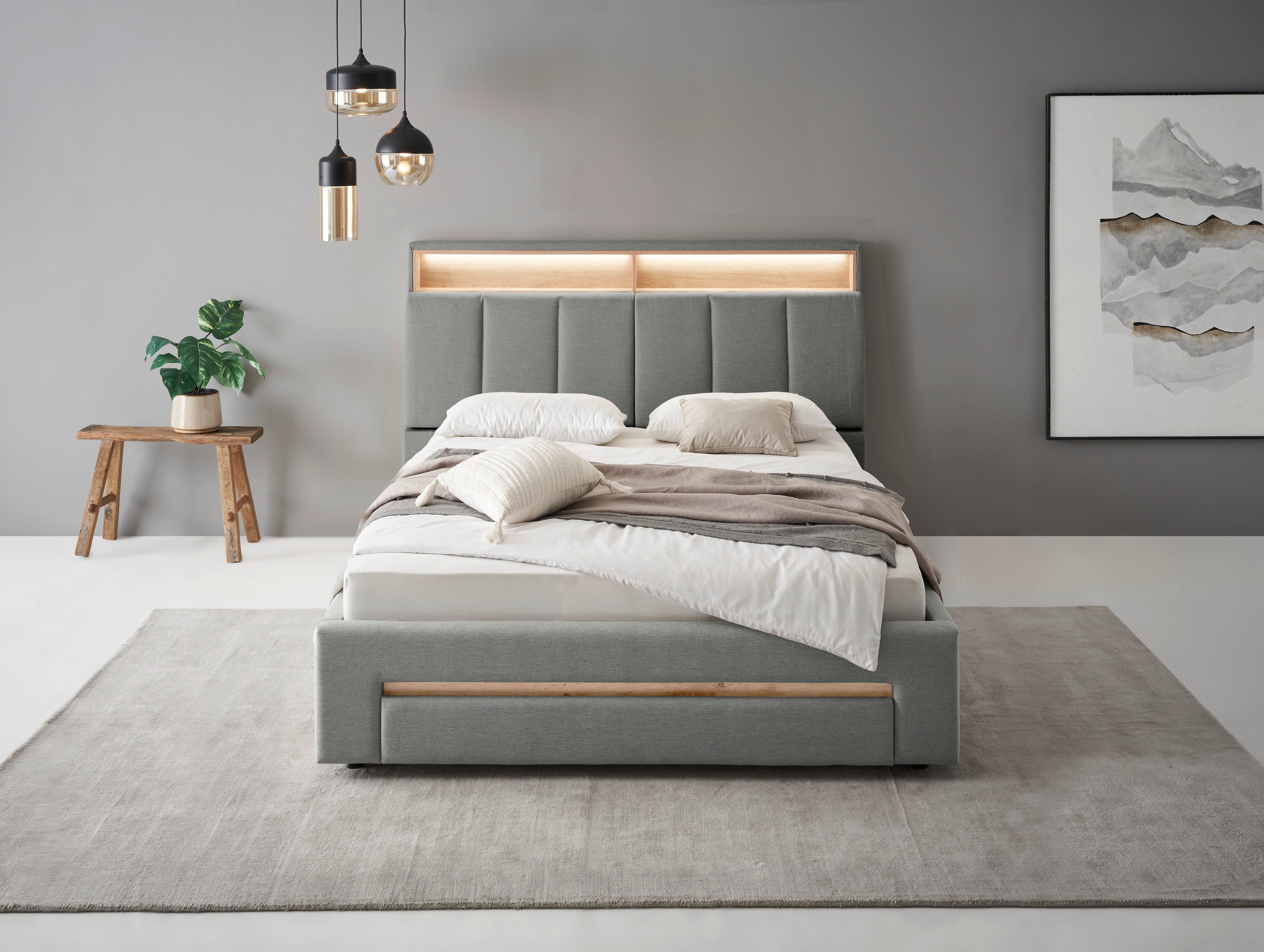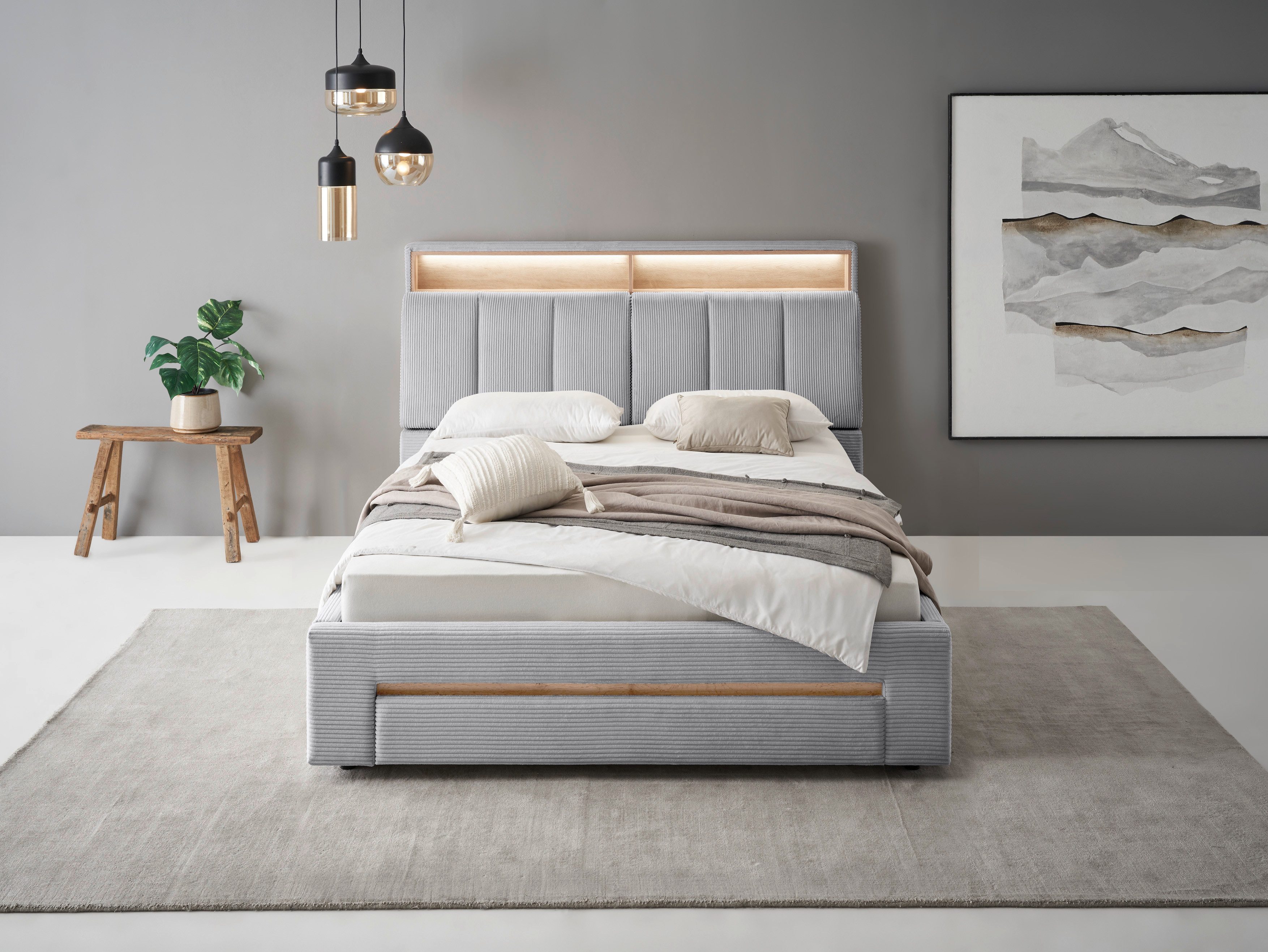 Hinweis Ausstattung | Ablagefach im Kopfteil vorhanden LED Beleuchtung ausziehbarer Bettkasten zusätzlicher Stauraum im Kopfteil |