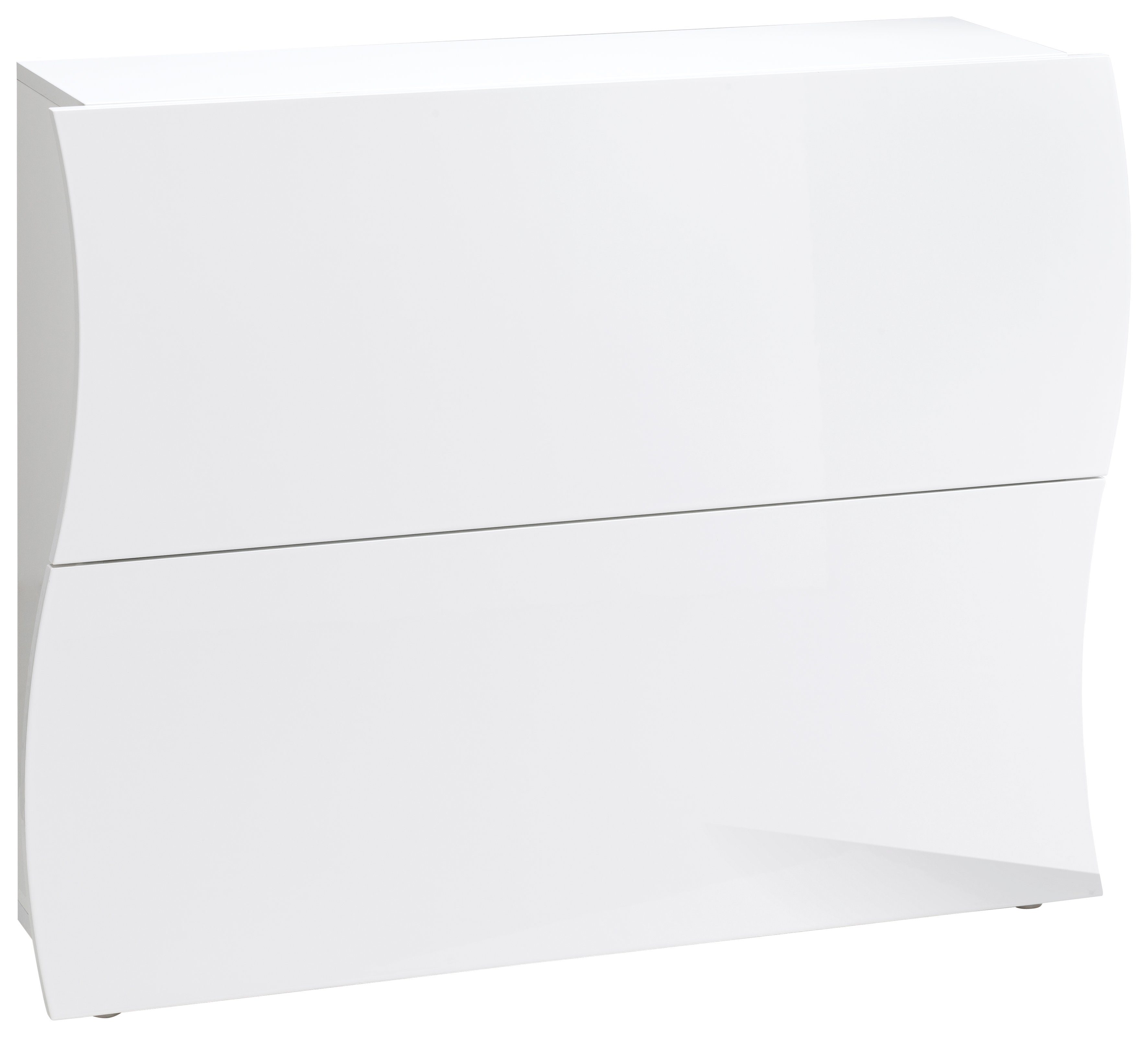 Wissenswertes | Der schöne Schuhschrank ist lackiert. Durch seine gut abgestimmten Maße (B/T/H: 91/27/81cm) bietet das schlichte Schränkchen Platz für bis zu 16 Paar Schuhe hinter zwei Klappfächern. Programm aus FSC zertifiziertem Holzwerkstoff, melaminharzbeschichtet. Komplett Hochglanz lackiert in 2 aktuellen Farben: weiss oder betonfarben. Wellenförmige Front. In folgenden Farben erhältlich: