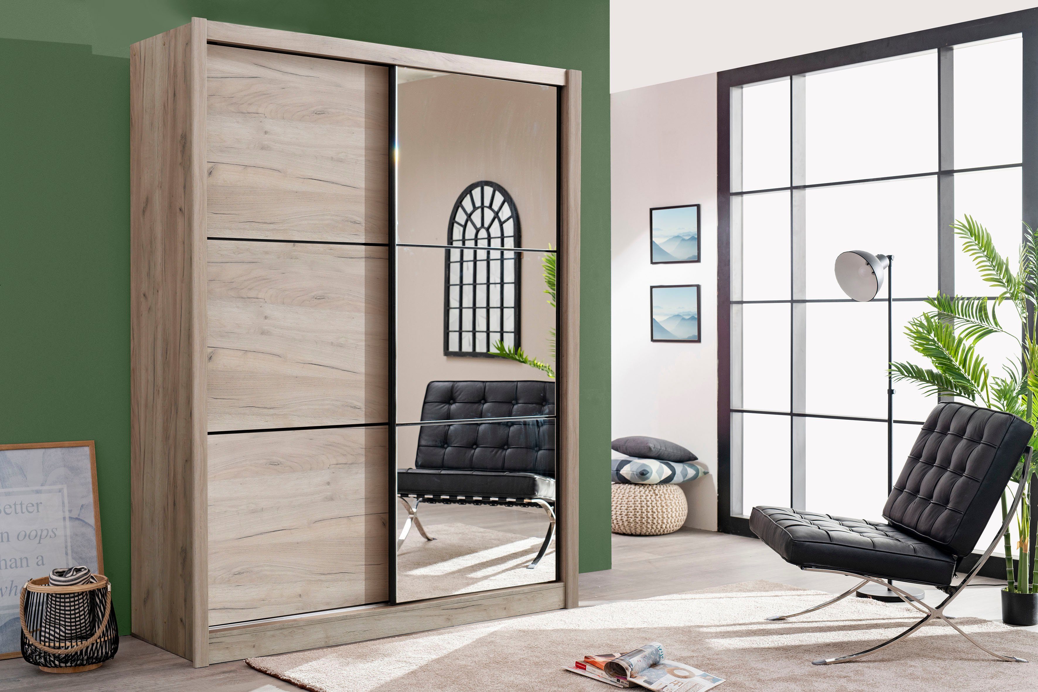 Der Schwebetürenschrank präsentiert sich im zeitlosen und modernen Look, der vielseitig kombinierbar ist. Um den trendigen Wohnstil zu unterstreichen und noch gemütlicher zu gestalten, sind zum Beispiel Pastellfarben empfehlenswert. Auch Accessoires wie Glas oder Naturstein passen gut. Er gehört zur Navara Serie, die weitere Artikel in diesem Stil enthält. So kannst du ein harmonisches Gesamtbild zaubern.