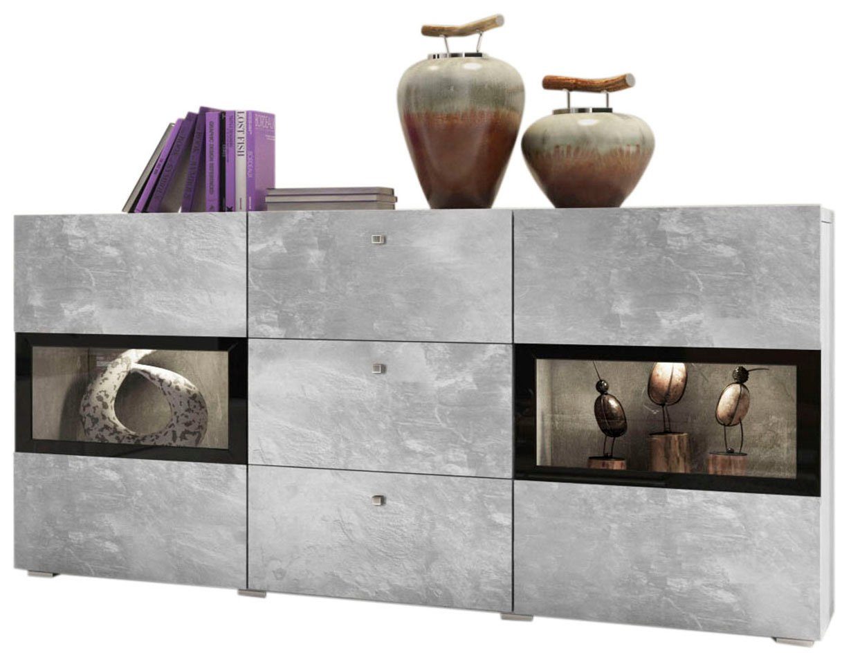 Wissenswertes | Dieses moderne Sideboard »Baros« mit pflegeleichten Fronten und Ganzmetallscharnieren, hergestellt aus FSC®-zertifiziertem Holzwerkstoff besticht nicht nur durch sein gelungenes Äußeres. Die Türen mit etwas Überstand für ein leichtes Öffnen) links und rechts mit Glaseinsatz bieten eine tolle Möglichkeit, Deko-Accessoires gut sichtbar zu präsentieren. Als Zubehör gibt es optional bestellbare Beleuchtungssysteme, die die Ausstellungsstücke zusätzlich ins richtige Licht zu rücken. Hinter den 3 Schubkästen (oberer Schubkasten mit einem leichten Überstand) verbirgt sich viel Stauraum um Dinge blickdicht zu verstauen. Das Möbelstück ist auch in kleinen Räumen ein absoluter Hingucker. In folgenden Farben erhältlich: