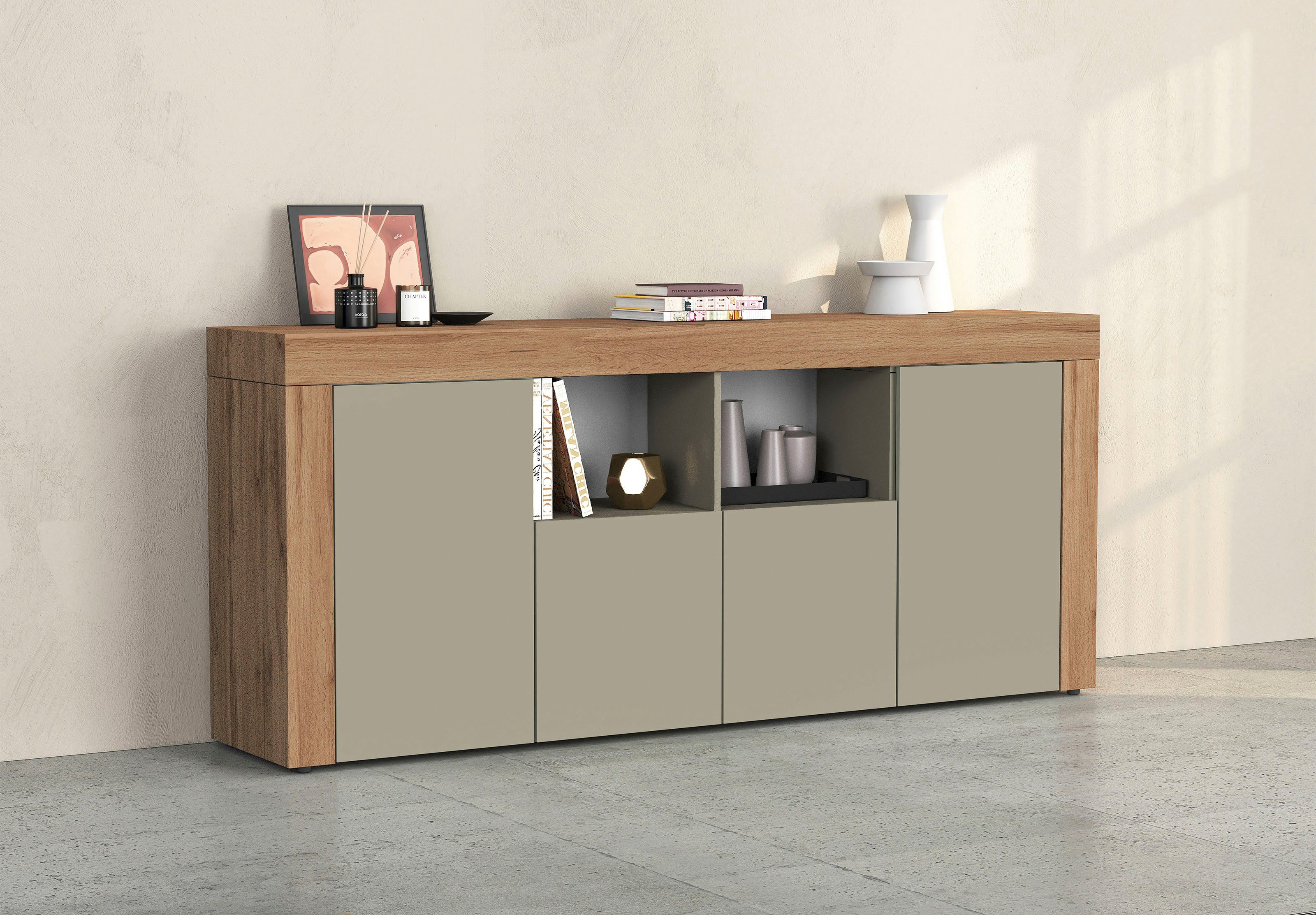 Dieses angesagte Sideboard »CHRONOS Breite 200 cm mit 4 Türen, 2 offene und 8 geschlossene Fächer« von INOSIGN besticht durch seine schlanke Form und bietet dir zusätzlichen Stauraum im Wohn- oder Schlafbereich. Da das Sideboard mit Push-to-open-Funktion ausgestattet ist, reicht schon ein kurzer Druck und die Türen öffnen sich wie von allein. Das ist praktisch und sorgt für eine cleane Optik.