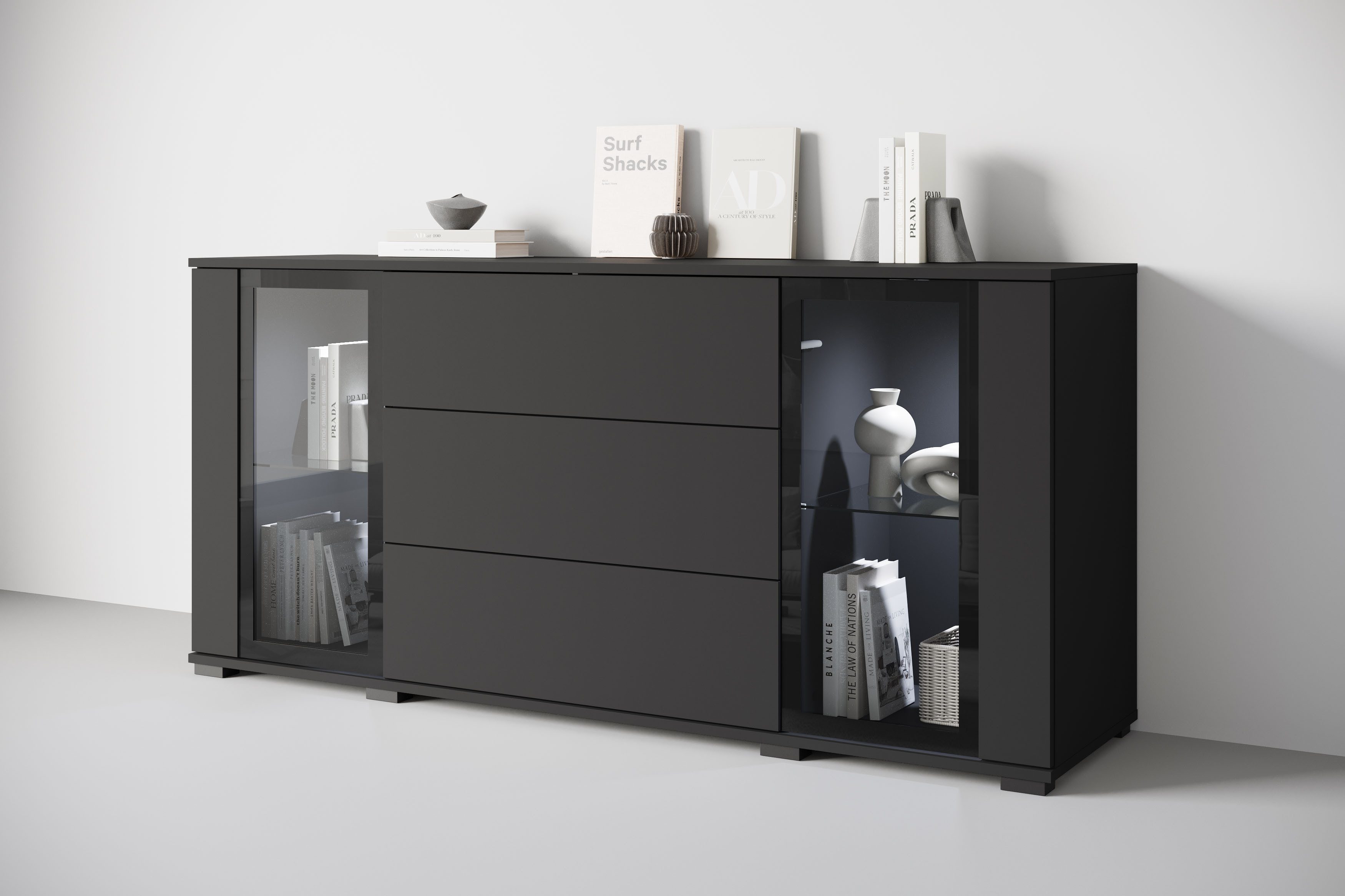 Du fragst dich, wie sich das Möbelstück kombinieren lässt? Hier eine kleine Inspiration für dich: Die Ästhetik des modernen Stils ist reduziert und strahlt eine schlichte Eleganz aus. Indem du die Einrichtung in dezenten Farben wie Weiß oder Grau hältst, Materialien aus Glas oder Naturstein bevorzugst und dich aufs Wesentliche fokussierst, unterstreichst du die Schönheit des Minimalismus. Es gehört zur CARO Serie, die weitere Artikel in diesem Stil enthält. So kannst du ein harmonisches Gesamtbild zaubern.