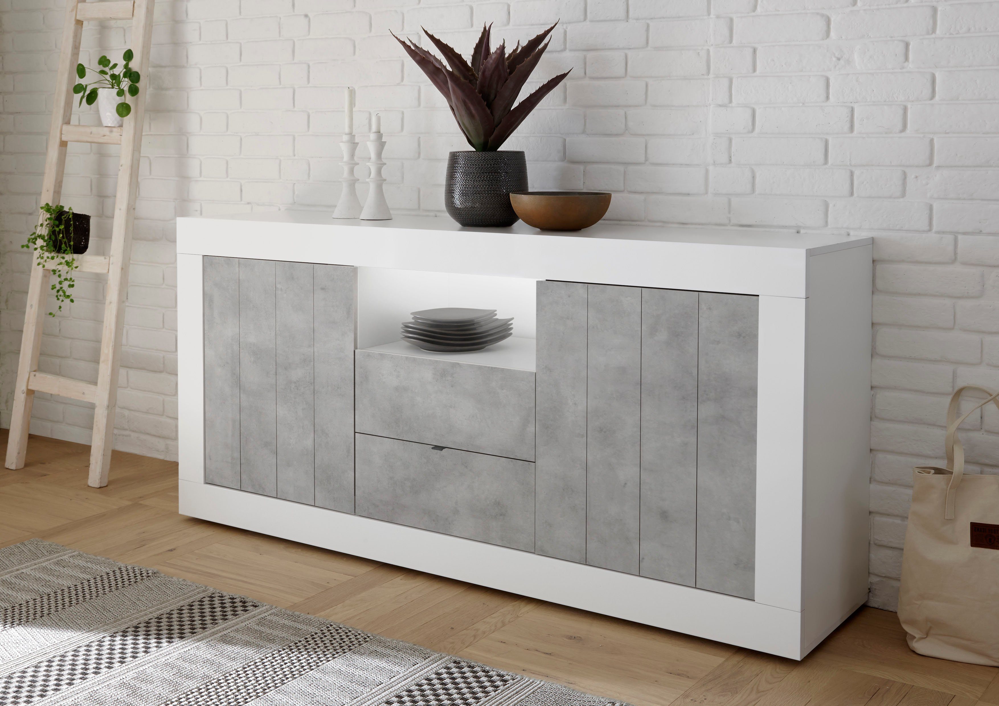 Wissenswertes | Das Modell »URBINO« besticht durch seine attraktive Kombination aus Holzoptik und weiß Echt Hochglanz Lack. Die außergewöhnliche Aufteilung der Elemente macht das Modell besonders interessant. Mit der dekorativen Rahmenoptik liegt das italienische Programm voll im Trend und die Fronten, die dank Siebdruck wie einzelne Holzpaneele wirken, sorgen für einen trendy Eyecatcher. »URBINO« punktet aber nicht nur durch seine moderne Optik, sondern bietet auch viel Platz. Während die Nische sich perfekt für die Präsentation von beispielsweise Dekoelementen eignet, verbirgt sich hinter den Fronten ausreichend Stauraum. In folgenden Farben erhältlich: