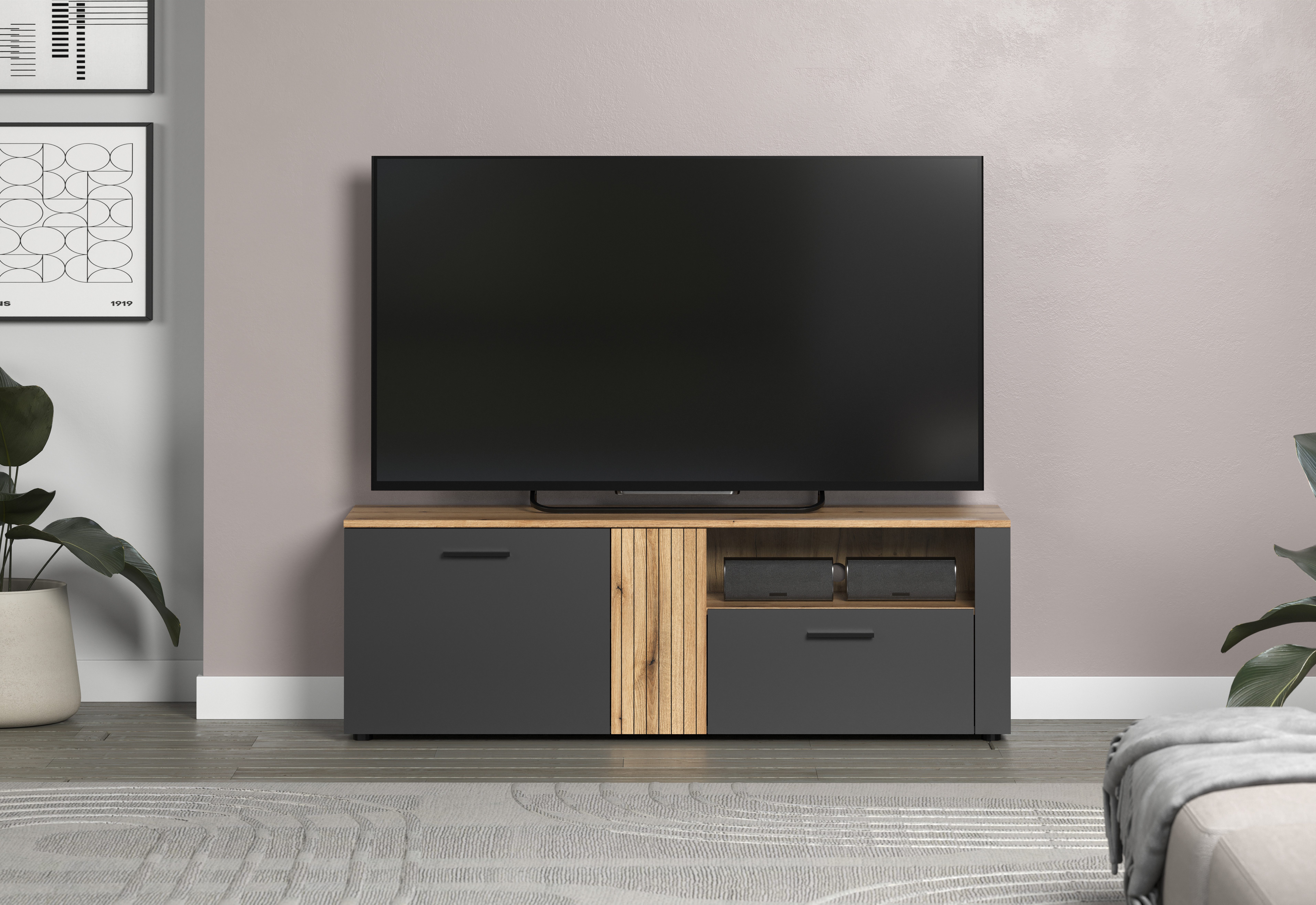 Dank der dafür vorgesehenen Öffnungen, können alle Kabel deiner Geräte problemos durch das Möbelstück hindurch verlegt werden. Das Modell lässt sich außerdem genau auf dich und deine Einrichtung anpassen, denn der Türanschlag kann entweder rechts oder links montiert werden. Auch ein Platz für Zeitschriften oder Spiele ist vorhanden: Die Schublade bietet dir zusätzliche Möglichkeiten zum Verstauen deiner Sachen. Um das Sideboard genau auf deine Bedürfnisse auszurichten, sind die Einlegeböden flexibel einsetzbar.