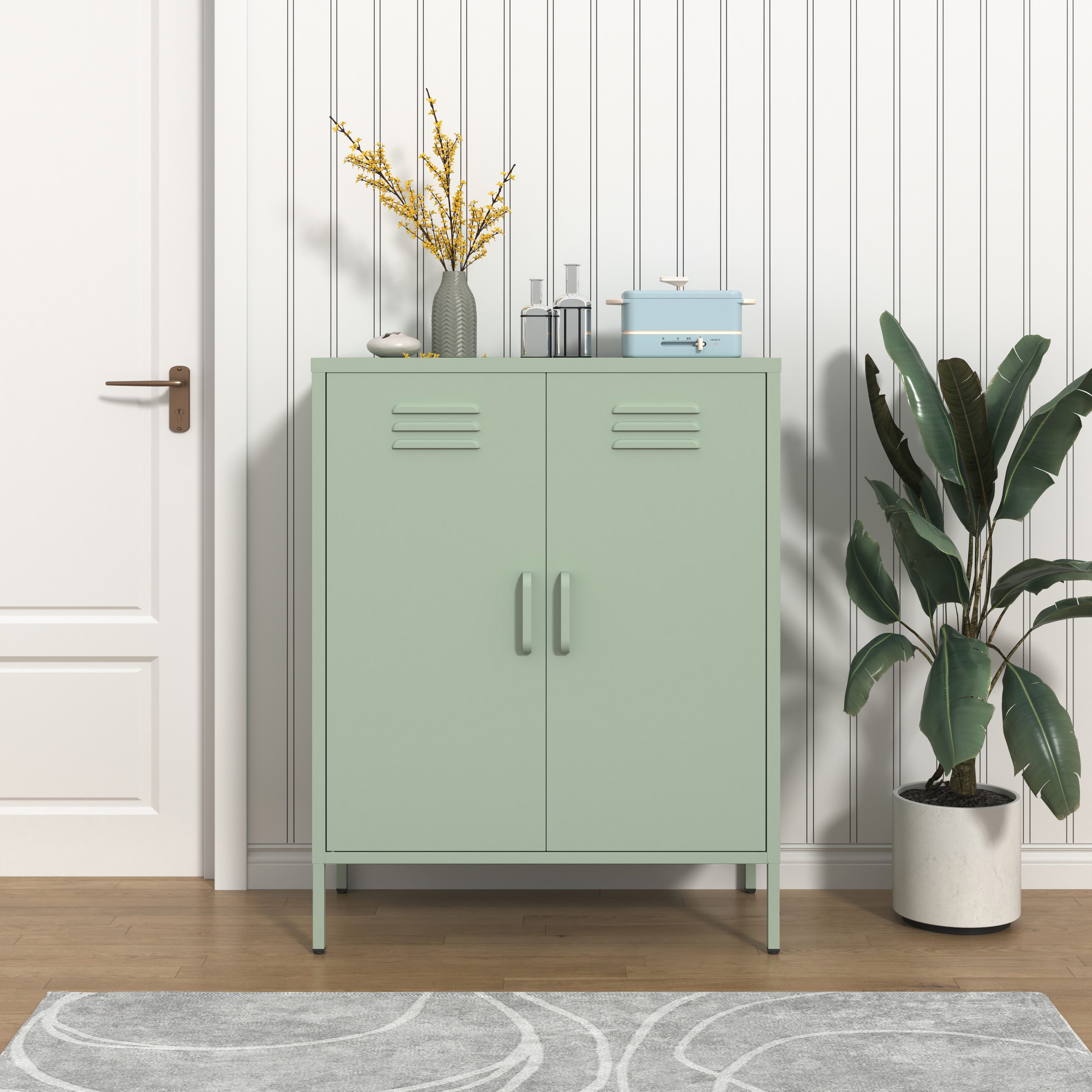 Aus Metall gefertigt, ist der Schrank besonders stabil und belastbar. Für einen tollen optischen Effekt und einen besseren Schutz der Oberfläche sorgt der aufgetragene Lack. Die Griffe aus Metall sind langlebig und unterstreichen den Stil.