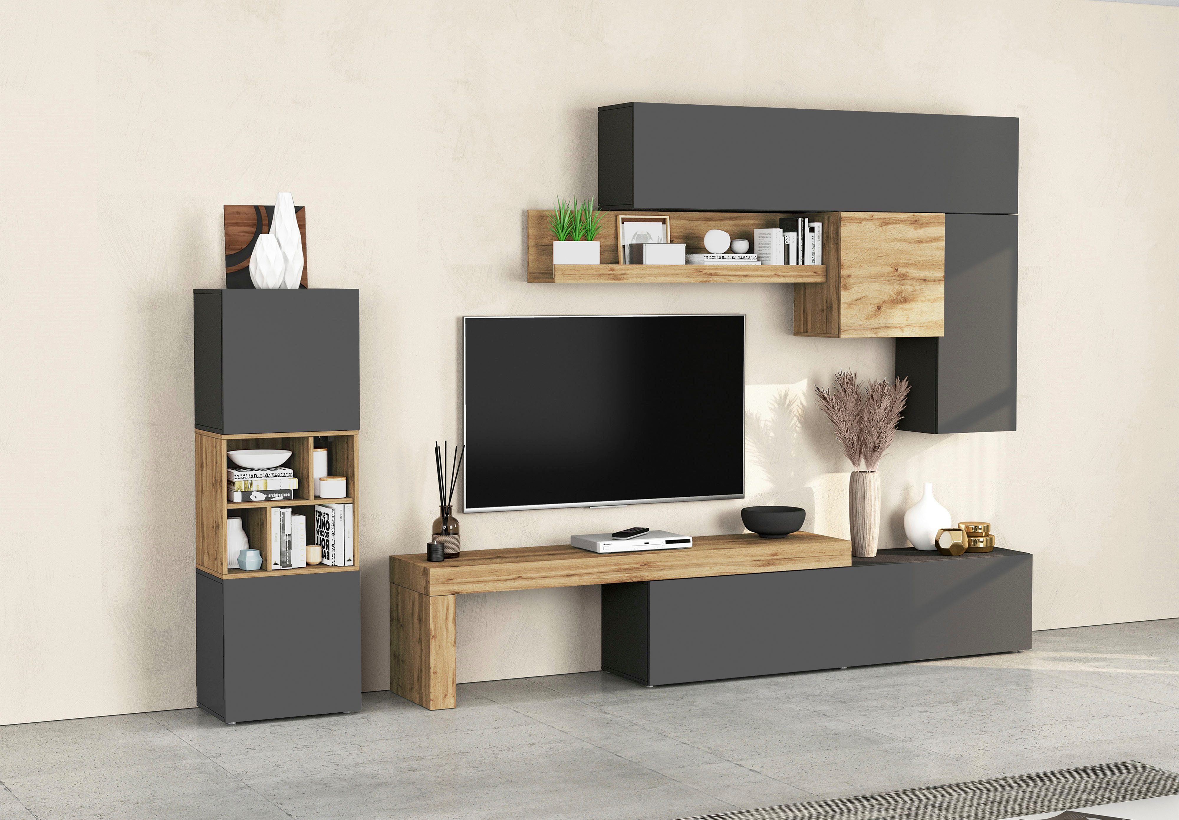 Ausstattung Schrank 2 | TV board mit 2 geschlossene Fächer,1 Klappe und ein L-Förmiger Aufsatz |
