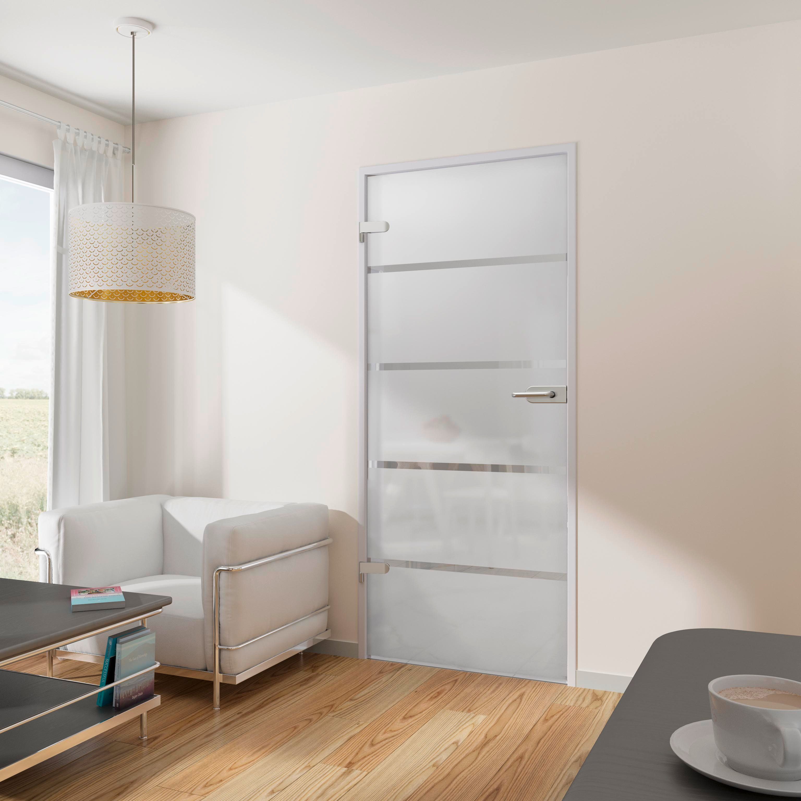 Die Zimmertür besteht aus 8 mm starkem Sicherheitsglas (ESG) mit einer aufgebrachten Keramikbeschichtung. Die edlen Beschläge aus eloxiertem Aluminium in Edelstahloptik runden das elegante Design ab.
