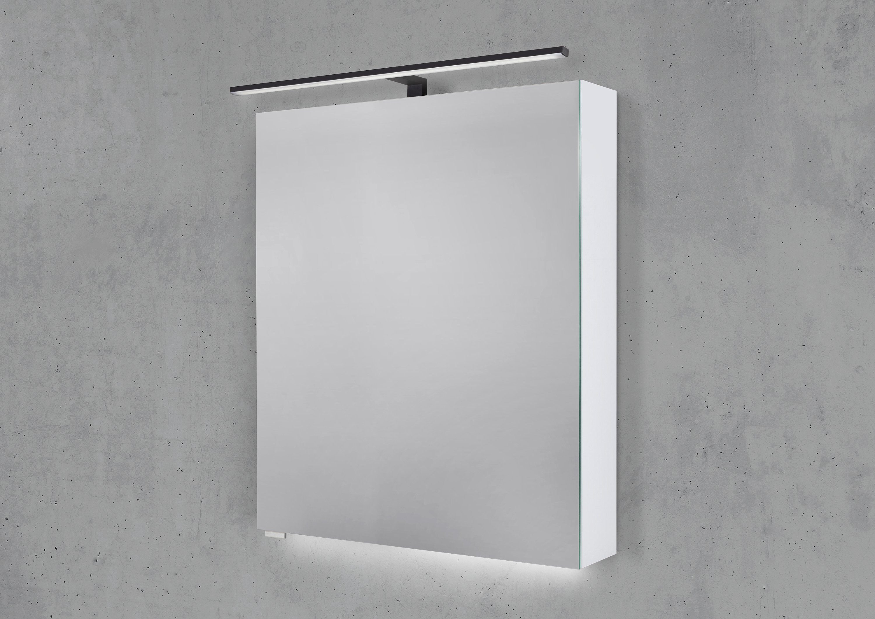 Hochwertiges und Elegantes Design bieten wir mit unseren Spiegelschränken Made in Germany. Mit unserer neuen MULTI-LED-Aufsatzleuchte entsteht eine wohnliche Bad-Atmosphäre - natürlich in Kombination mit dem schlichten Spiegelschrank von Intarbad in edlem Design. Die moderne und schlichte LED-Leuchte besitzt eine stufenlos verstellbare Lichtfarbe, die sich bequem per Drehschalter im Schrankinneren einstellen lässt. Die Helligkeit ist je nach Tageszeit und Wunsch dimmbar. Clever durchdacht mit integrierter Memory-Funktion, speichert die MULTI-LED-Aufsatzleuchte ganz komfortabel die zuletzt gewählte Lichteinstellung. Individuelle Auswahlmöglichkeiten bieten ebenso die über 20 Spiegelschrank-Korpus-Dekore von natürlichen Holztönen bis hin zu edlen Lack-Fronten. Es besteht zusätzlich die Wahl zwischen zwei Tiefen. Auch bei den doppelt verspiegelten, sechs Millimeter starken Spiegeltüren wurde auf Hochwertigkeit geachtet. Mit integrierter Soft-Close-Funktion schließen die Türen leise und sanft. Zwei höhenverstellbare Glasböden mit auf Hochglanz polierten Kanten und Kippschutzfunktion bieten viel Platz für Badutensilien wie Lotion, Parfum und Make-up. Außerdem sind im Inneren nützliche Elemente wie Steckdose mit Schalter, ein 3,5-facher Vergrößerungsspiegel und eine Magnetleiste integriert. Hier lassen sich beispielsweise Pinzette, Schere und Nagelfeile übersichtlich und sortiert anordnen. Tauchen Sie Ihr Bad in das atmosphärische Licht der MULTI-LED-Aufsatzleuchte