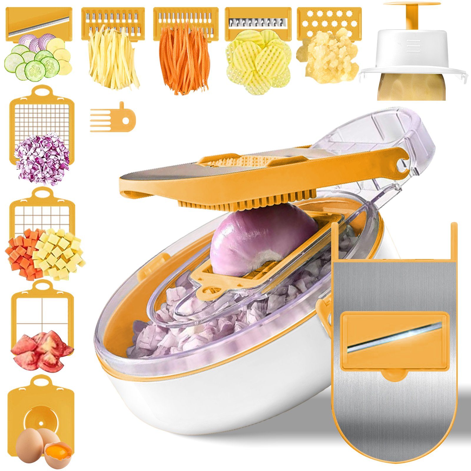 Mitgeliefertes Zubehör | 1 x Edelstahl-Oberflächenabdeckung 1 x integrierte Reinigungsplatte 3 x Würfelklingen (groß, mittel, klein) 2 x Zerkleinerungsklingen (grob, fein) 1 x Wellenschneider 1 x Glatter aufschneider 1 x Klingenaufbewahrungsbox 1 x Reinigungsgabel 1 x Eiweißtrenner 1 x Knoblauchmühle 1 x Filterkorb (1800ml) 1 x Körbchen (1800ml) |