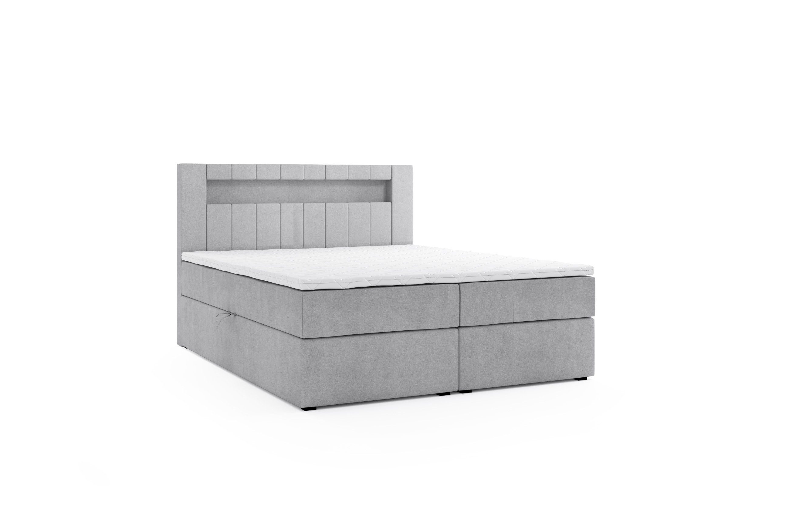 Der Bettkasten bietet zusätzlichen Stauraum für Bettwäsche und mehr. Das Kopfteil mit Samt Bezug verleiht dem Bett einen gemütlichen Look. Die Box ist mit weichem Samt bezogen, was dem Schlafzimmer eine elegante Note verleiht.