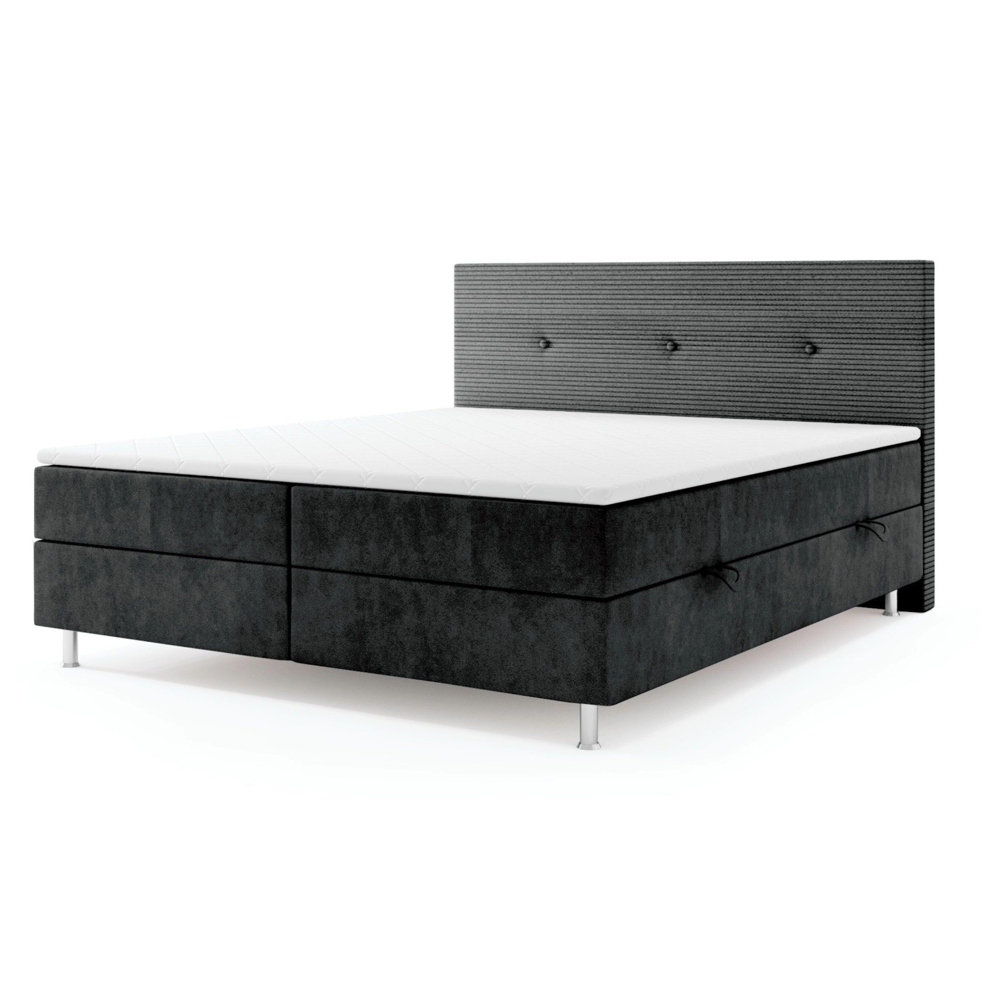 Der Bettkasten bietet zusätzlichen Stauraum für Bettwäsche und mehr. Das Kopfteil mit Cord Bezug verleiht dem Bett einen gemütlichen Look. Die Box ist mit weichem Webstoff bezogen, was dem Schlafzimmer eine elegante Note verleiht.