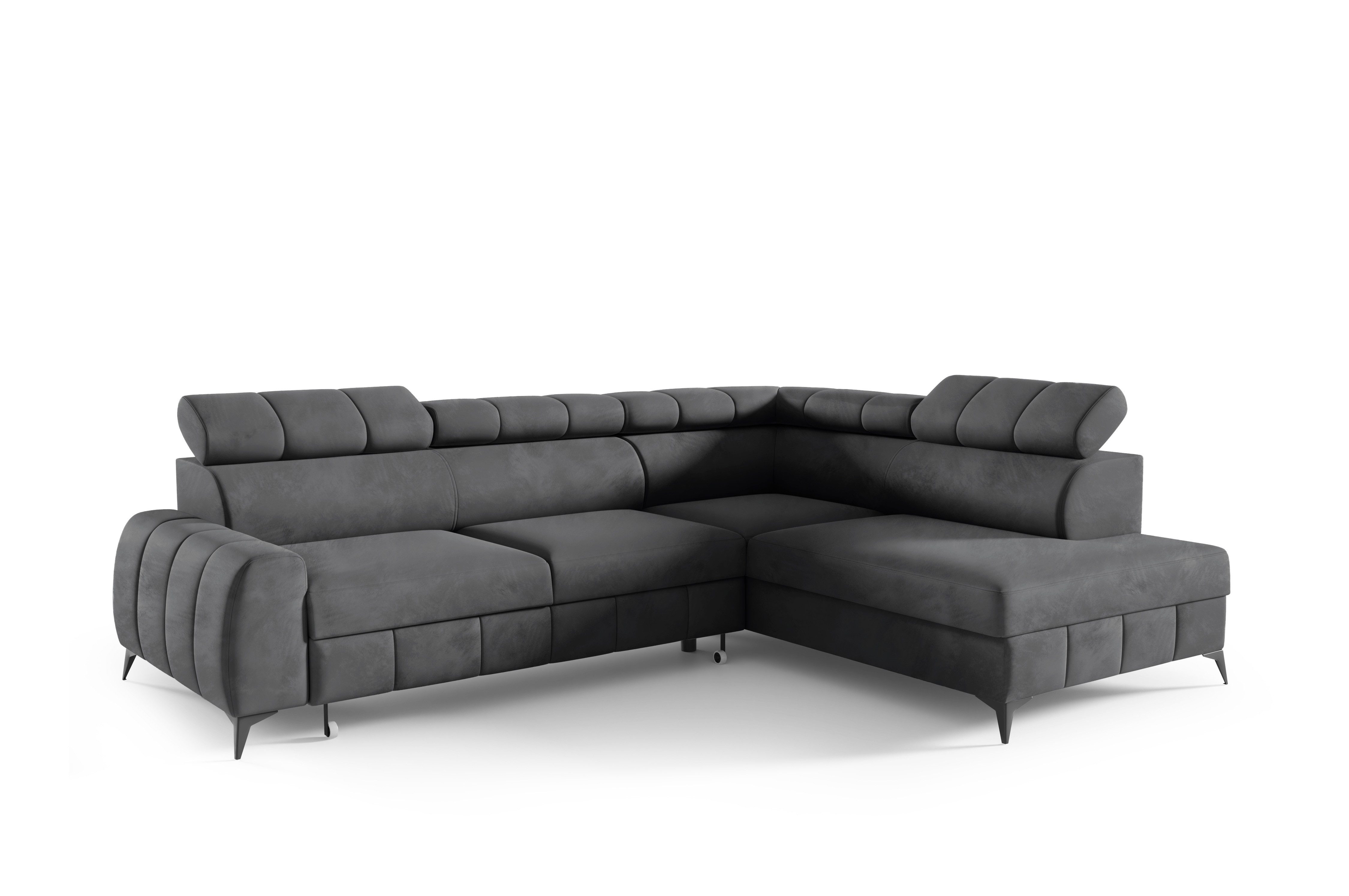 Wohnlandschaft Ecksofa LIMA Samt Grau Anthrazit mit Bett Bettkasten Kopfteilverstellung Bett Sofa Schlafsofa Ottomane rechts