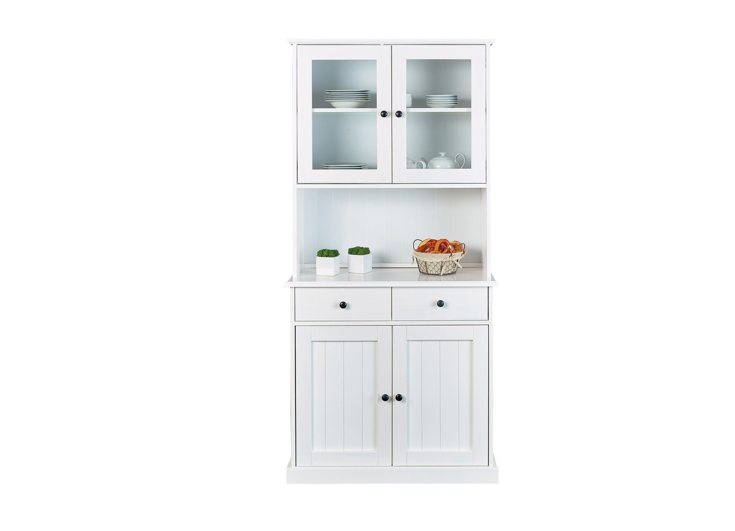 Die offenen Regalfächer des Schranks bieten ideale Möglichkeiten, um dekorative Elemente wirkungsvoll in Szene zu setzen. Setzen Sie farbliche Akzente und nutzen Sie die Flächen, um Ihre persönlichen Gegenstände stilvoll zu präsentieren. Der Schrank umfasst zwei Schubladen, zwei Fachböden und vier Türen, was umfangreichen Stauraum für Ihre Küchenutensilien und andere Gegenstände bietet.